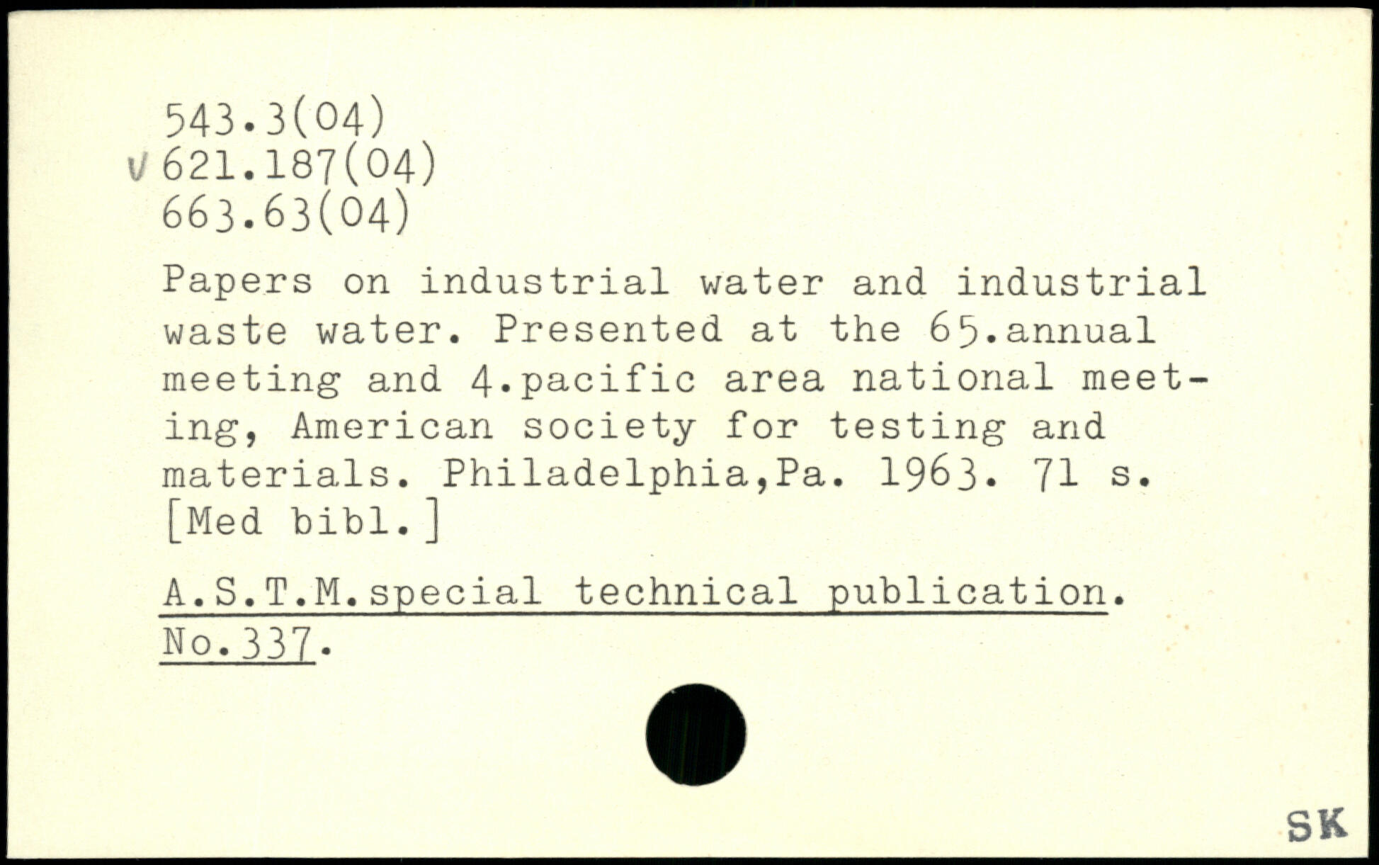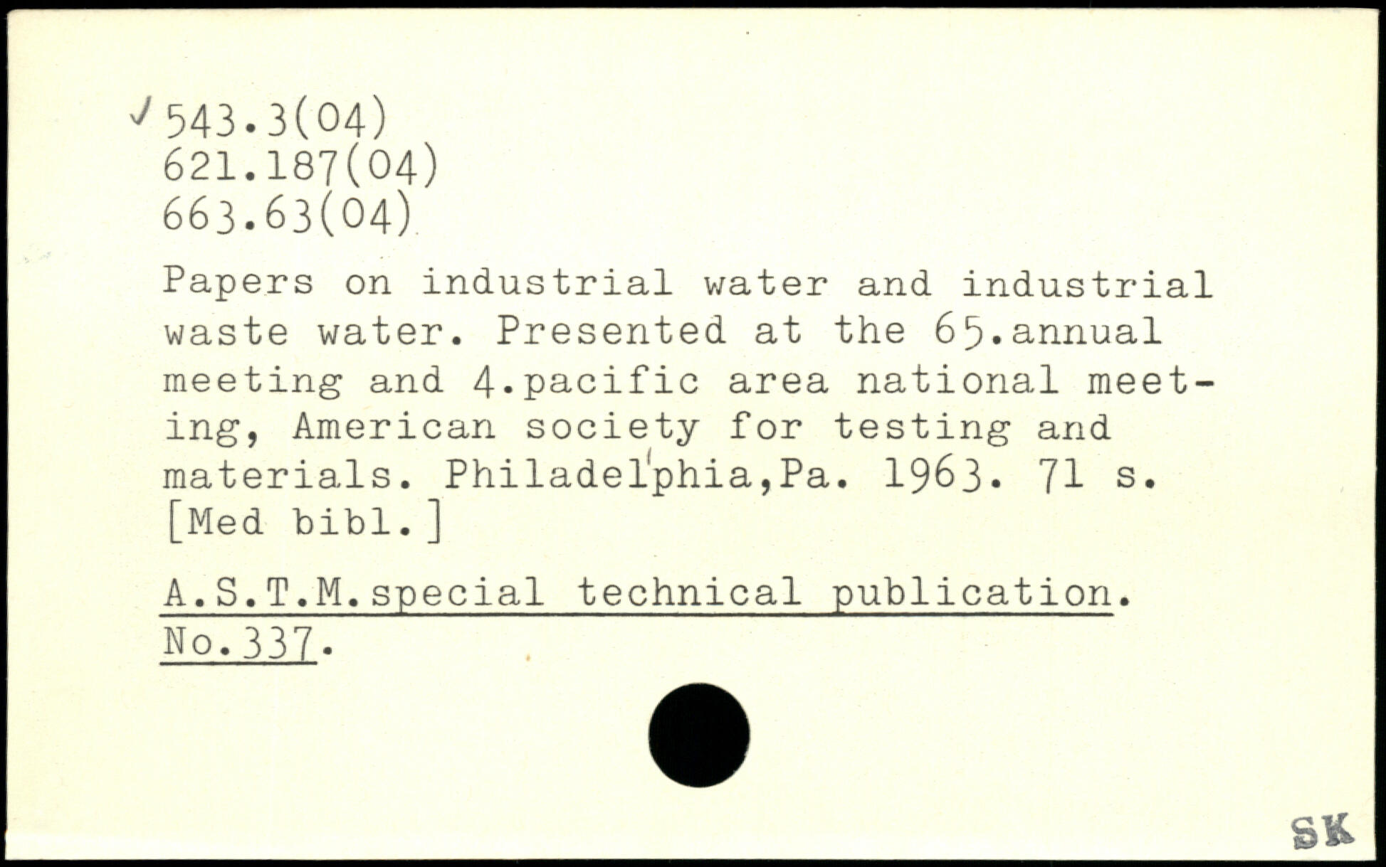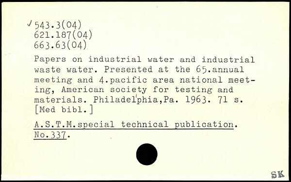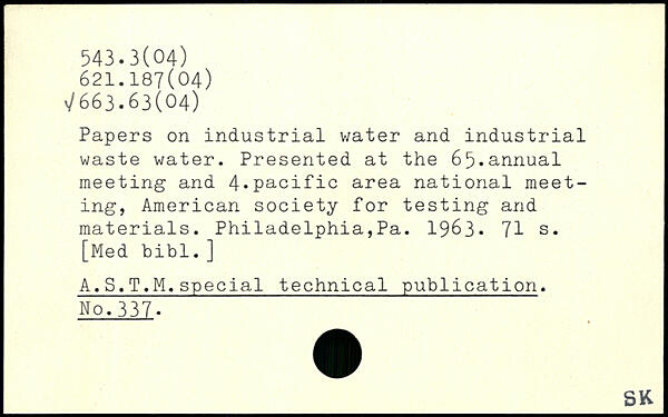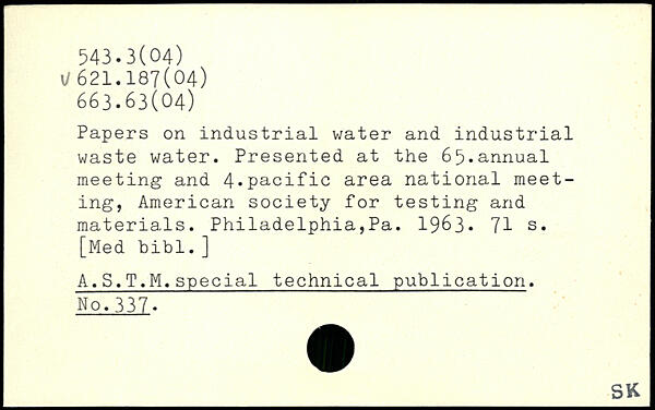 Papers on industrial water and industrial waste water. Presented at the 65.annual meeting and 4-pacific area national meeting, American society for testing and materials. Philadelphia,Pa. 1963