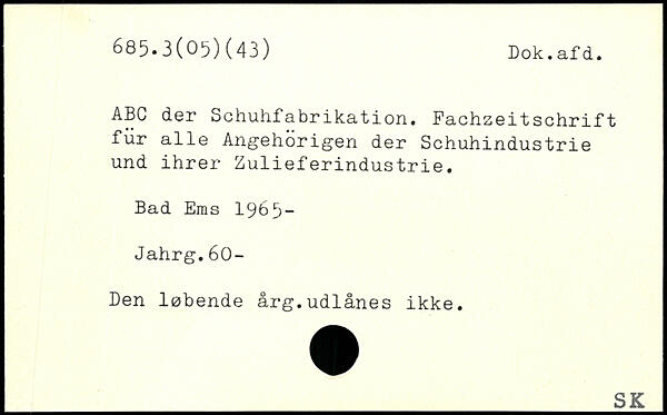 ABC der Schuhfabrikation. Fachzeitschrift fur alle Angehörigen der Schuhindustrie und ihrer Zulieferindustrie. Bad Ems 1965- Jahrg.60- Den løbende årg.udlånes ikke.