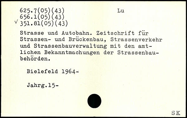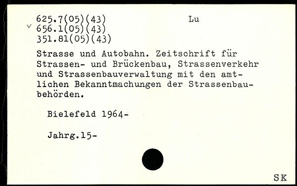 Strasse und Autobahn. Zeitschrift für Strassen- und Brückenbau, Strassenverkehr und Strassenbauverwaltung mit den amtlichen Bekanntmachungen der Strassenbau-behörden. Bielefeld 1964- Jahrg.15-
