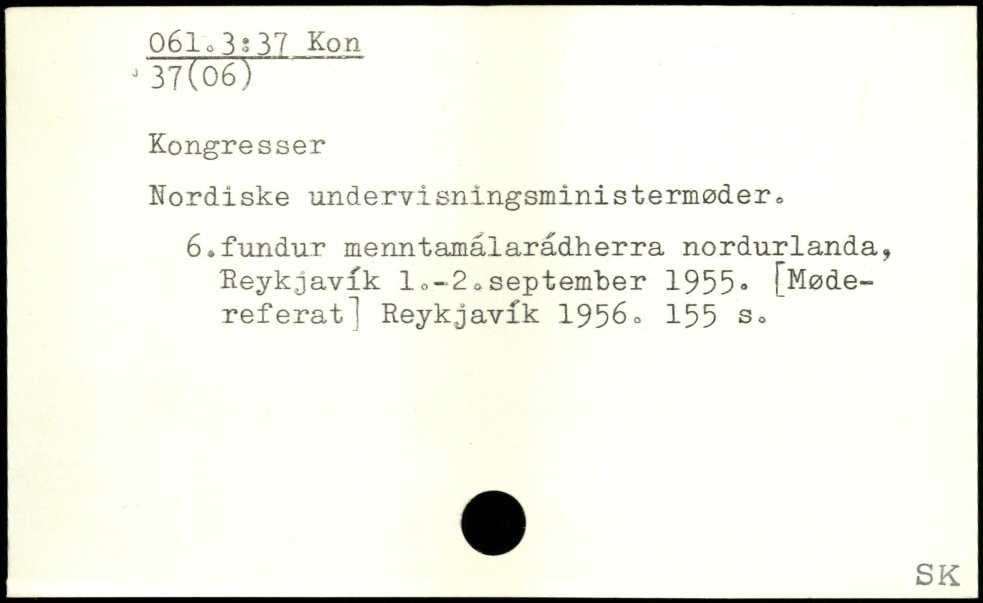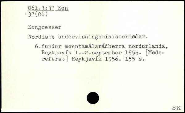 Nordiske undervisningsministermøder0 6.fundur menntamålaradherra nordurlanda, Reykjavik 1,-2. september 1955, [Mødereferat ] Reykjavik 1956.