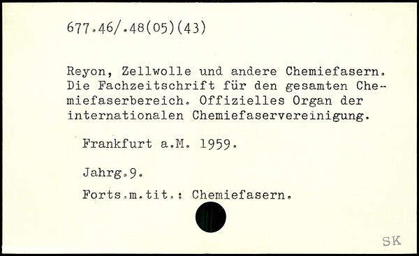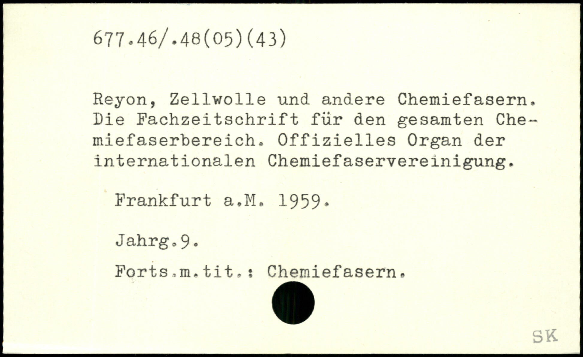 Reyon, Zellwolle und andere Chemiefasern. Die Fachzeitschrift für den gesamten Chemiefaserbereich. Offizielles Organ der internationalen Chemiefaservereinigung. Frankfurt a.M. 1959. Jahrg.9. Forts,m.tit.. Chemiefasern.
