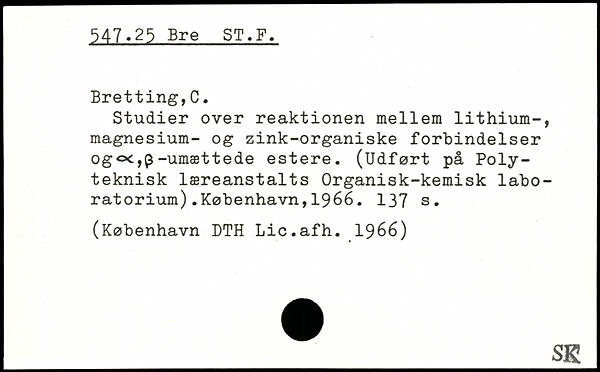 Studier over reaktionen mellem lithium-, magnesium- og zink-organiske forbindelser Ogoc,p-umættede estere. (Udført på Polyteknisk læreanstalts Organisk-kemisk laboratorium) .København, 1966.