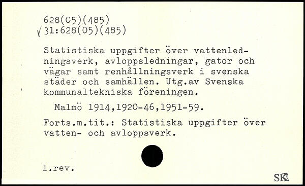Statistiska uppgifter över vattenledningsverk, avloppsledningar, gator och vagar samt renhållningsverk i svenska stader och samhällen. Utg.av Svenska kommunaltekniska föreningen. Malmö 1914,1920-46,1951-59. Forts.m.tit.s Statistiska uppgifter över vatten- och avloppsverk. !