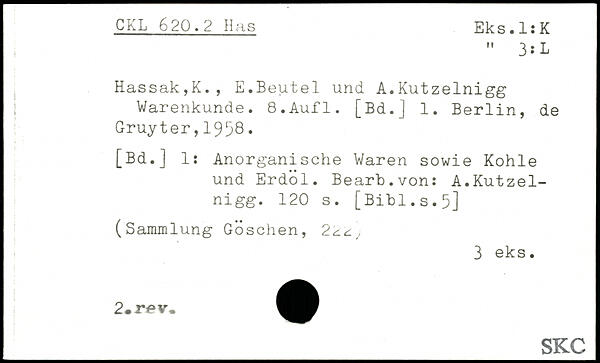 Warenkunde. S.Aufl. [Bd.J 1. Berlin, de Gruyter,1958, [Bd.] 1: Anorganische Waren sowie Kohle und Erdöl. Bearb.von: A.Kutzelnigg.