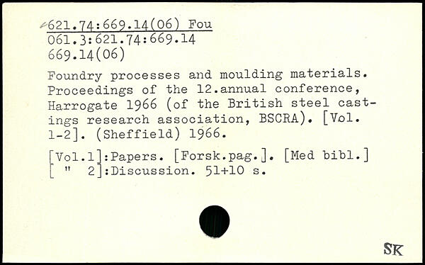 Foundry processes and moulding materials. Proceedings of the 12.annual conference, Harrogate 1966 (of the British steel castings research association, BSCRA). [Vol. 1-2]. (Sheffield) 1966. FVol.l]:Papers. [Forsk.pag.]. [Medbibl.] (_ M 2] :Biscussion.