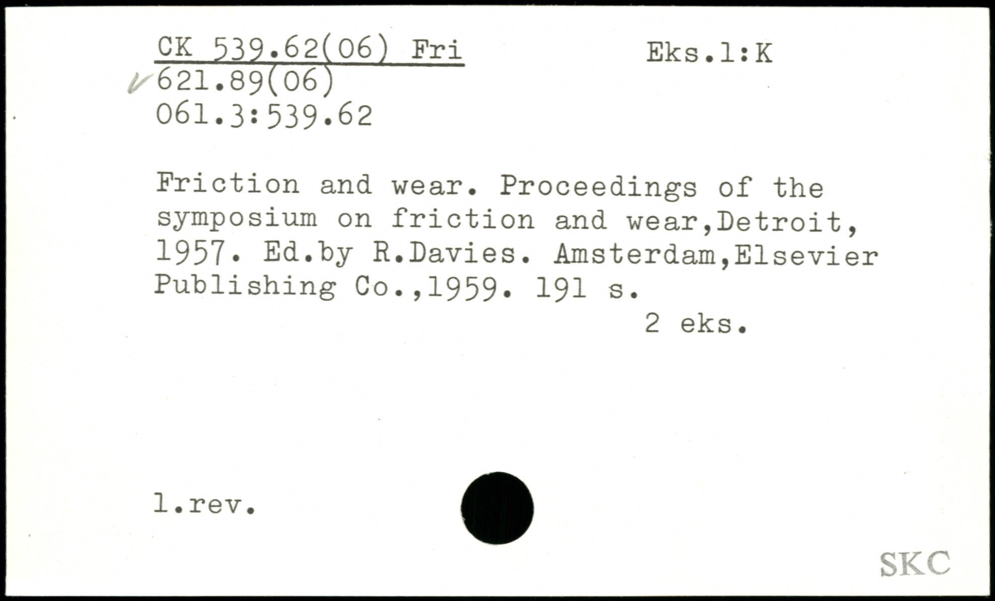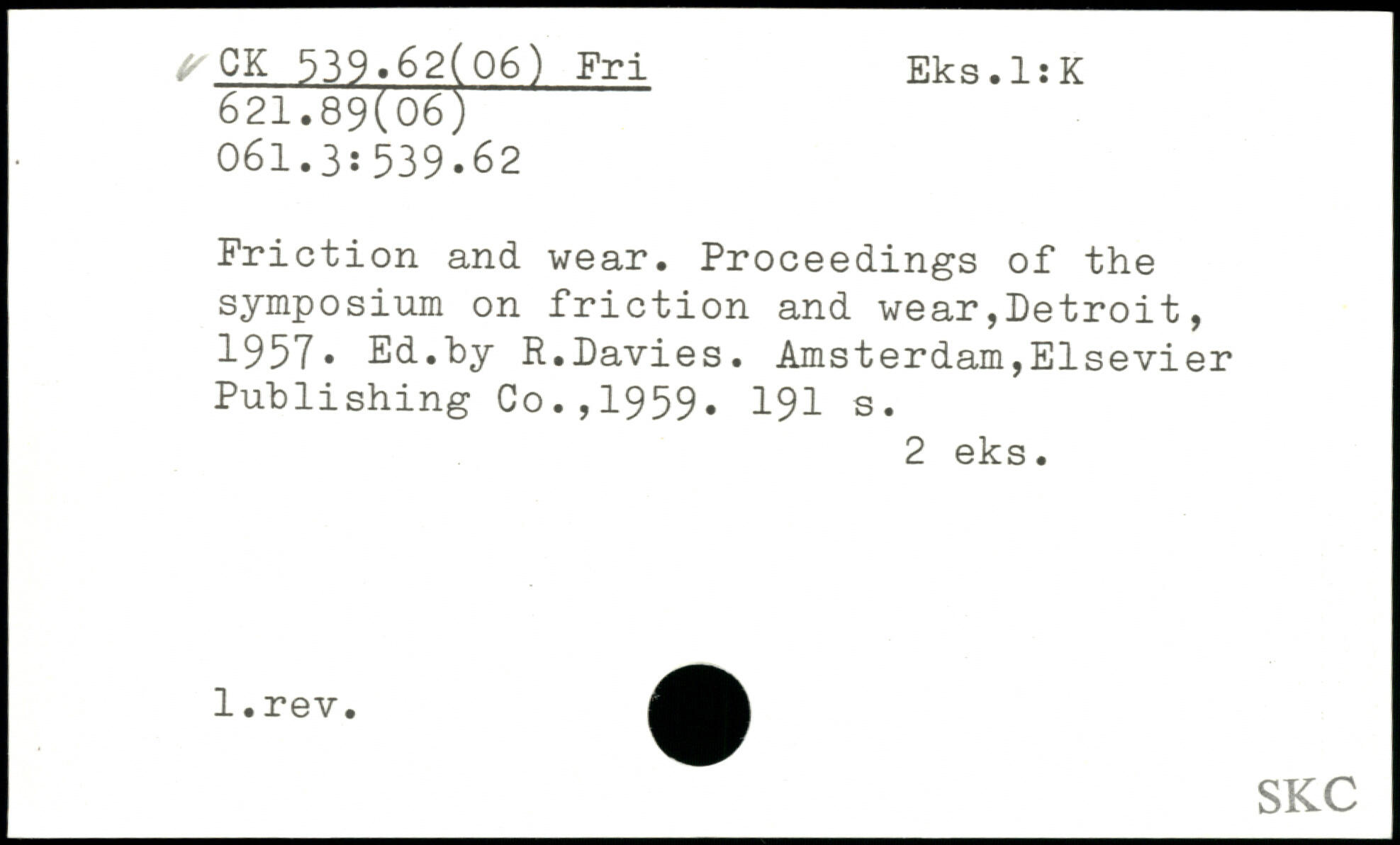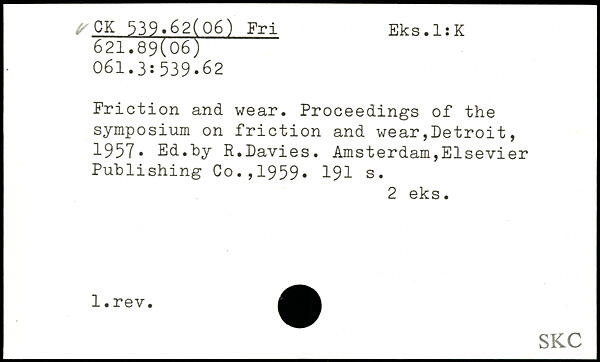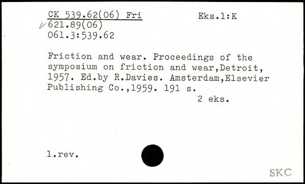 Friction and wear. Proceedings of the symposium on friction and wear,Detroit, 1957. Ed.hy R.Davies.