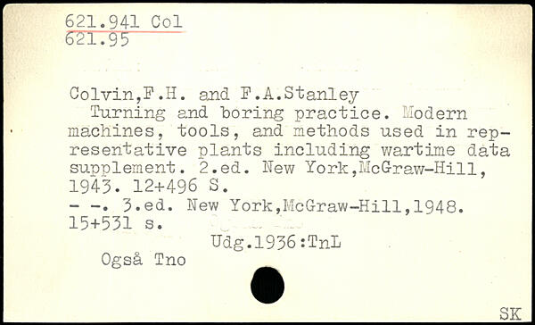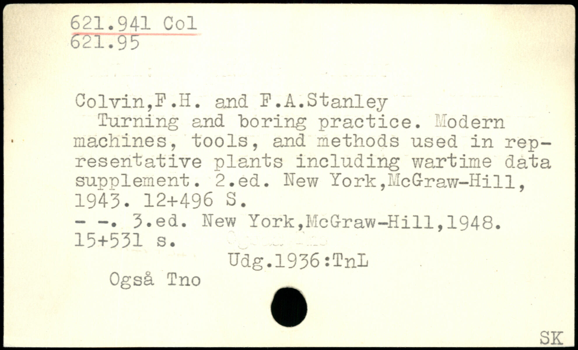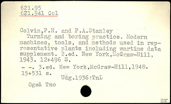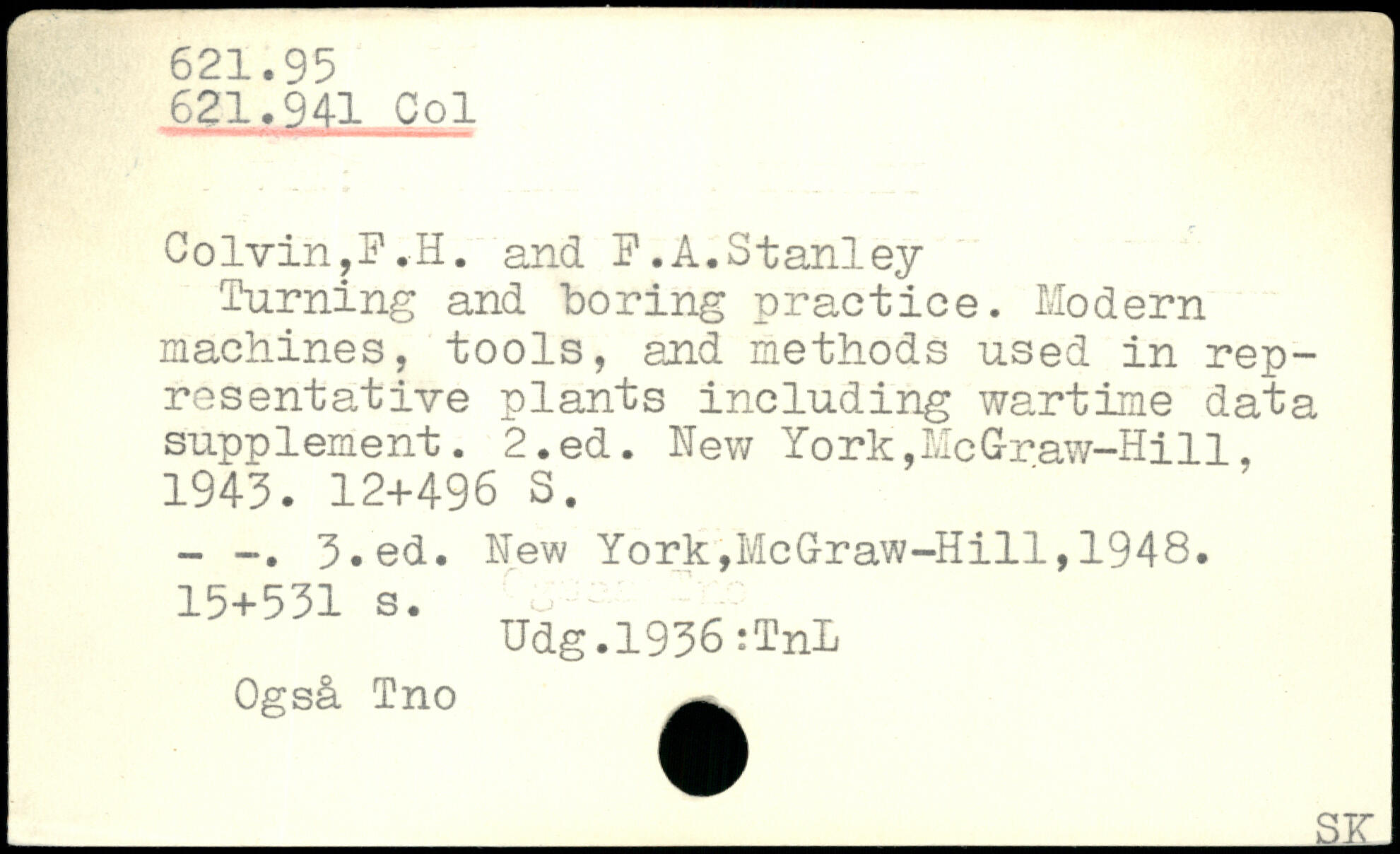 Colvin,!1 .H. and F. A.Stanley Turning and boring practice. Modern machines, tools, and methods used in representative plants including wartime data supplement.