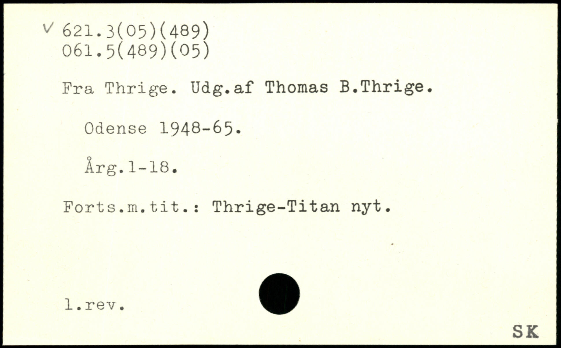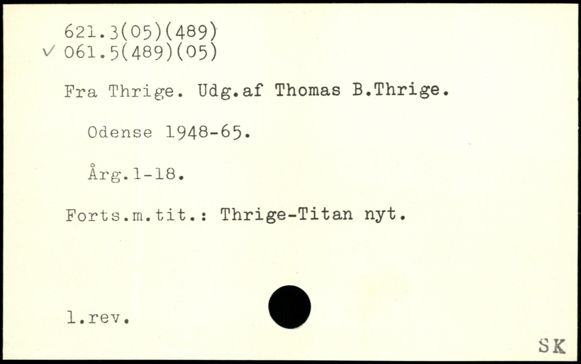 Fra Thrige. Udg.af Thomas B.Thrige. Odense 1948-65, Årg.1-18. Forts.m.tit.: Thrige-Titan nyt. ____