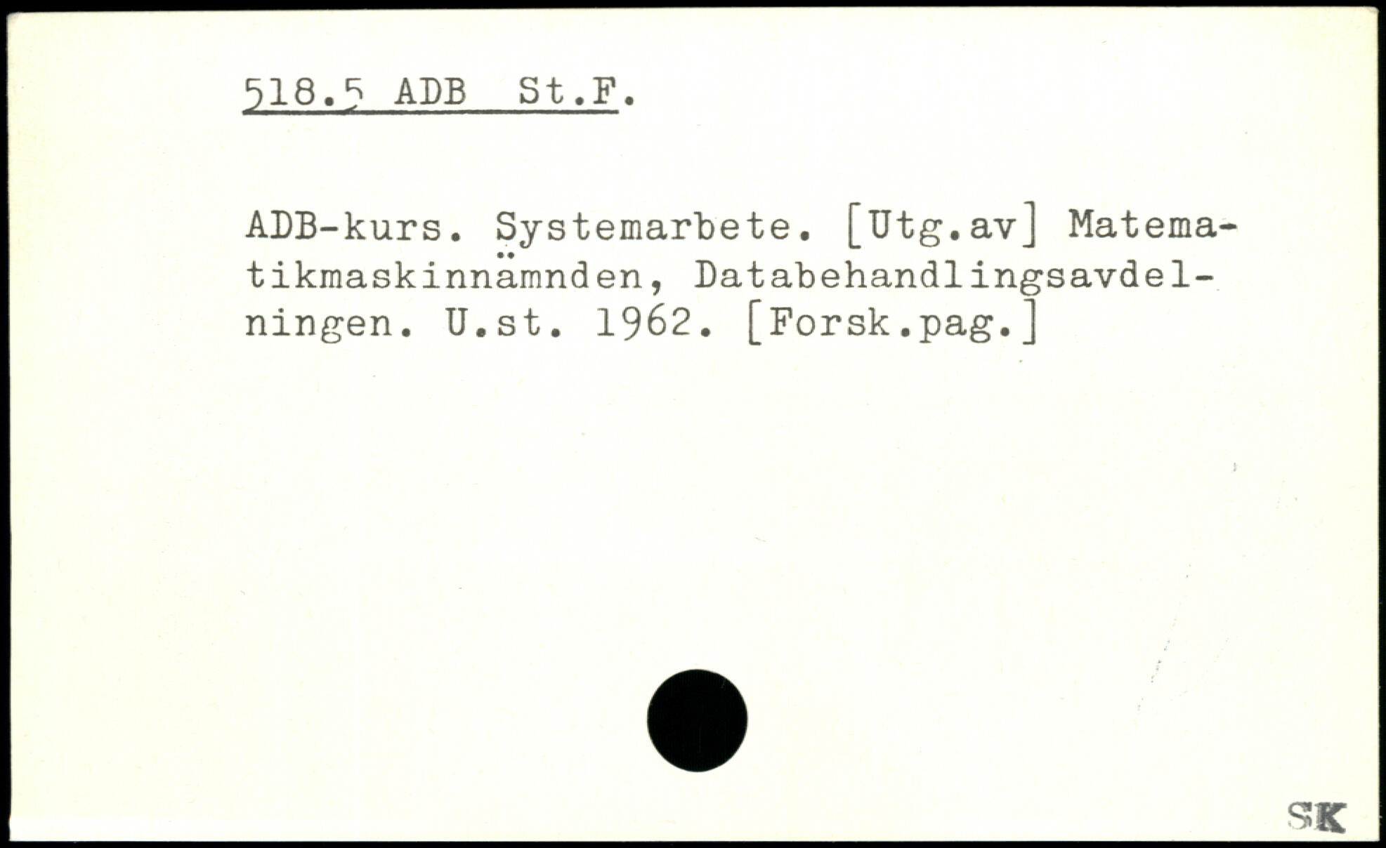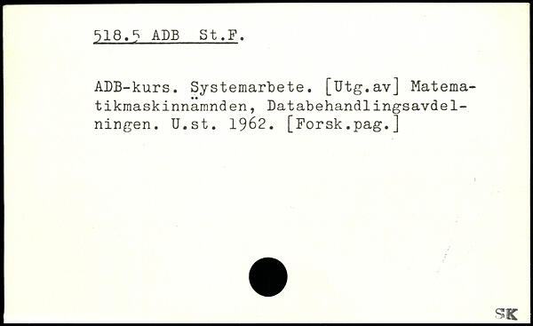 ADB-kurs. Systemarbete. [Utg.av] Matematikmask innamnden, Databehandlingsavdel-ningen. U.st. 1962. [Forsk.pag.]