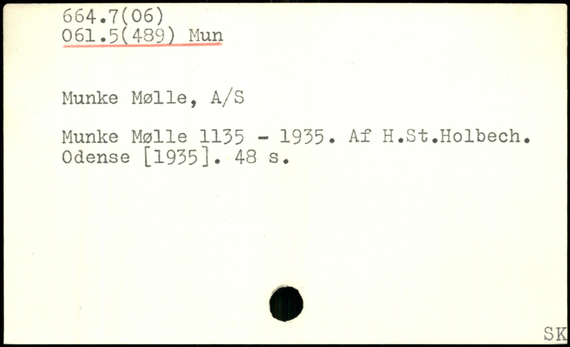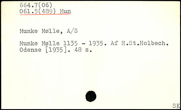 Munke Mølle, A/S Munke Mølle 1135 - 1935. Af H.St.Holbeeh. Odense [1935].