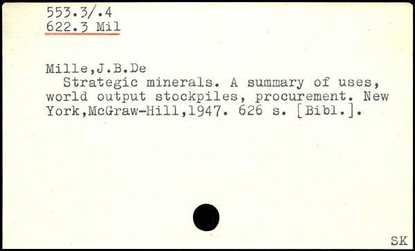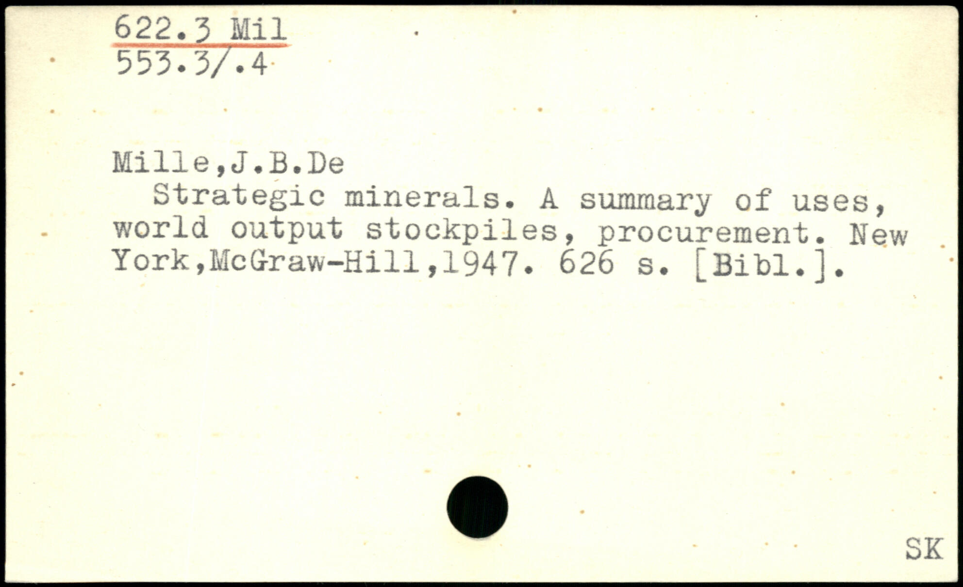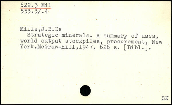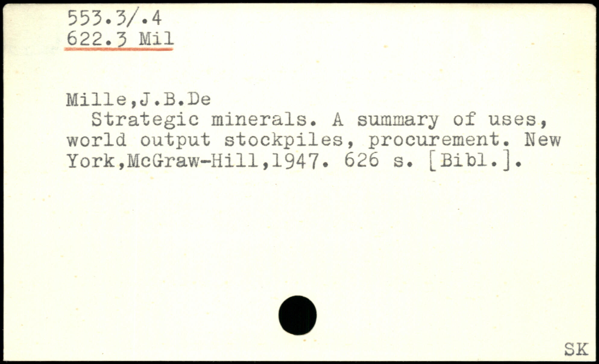Mille, J.B.De Strategic minerals. A summary of uses, world output stockpiles, procurement.