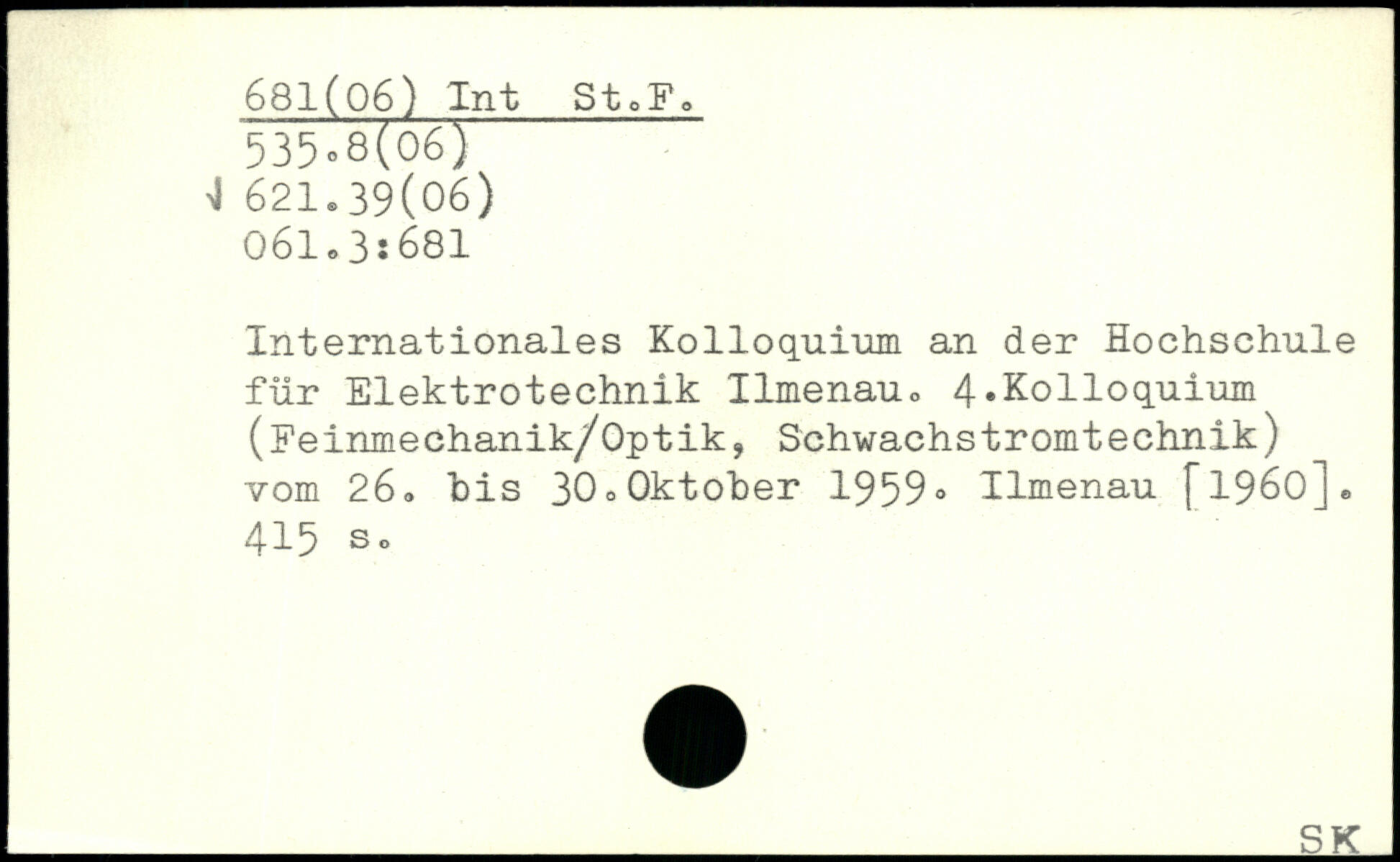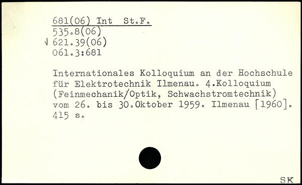 Internationales Kolloquium an der Hochschule für Elektrotechnik Ilmenau, 4.Kolloquium (Feinmechanik/Optik, Schwachstromtechnik) vom 26. bis 30,Oktober 1959, Ilmenau [1960].