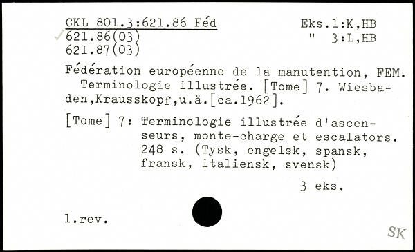 Fédération européenne de la manutention, FEM. Terminologie illustrée. [Tome] 7. Wiesbaden, Krausskopf,u.a.[ca.1962].