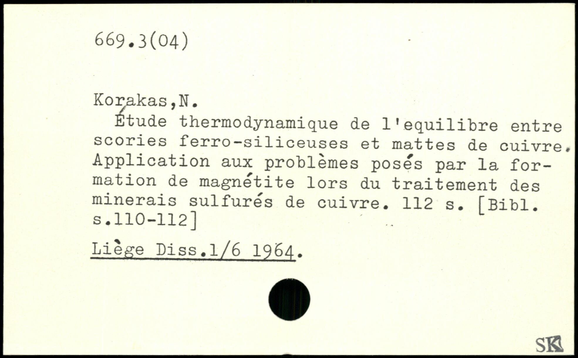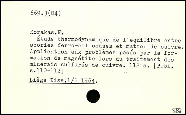 Etude thermodynamique de 1'équilibré entre scories ferro—siliceuses et mattes de cuivre# Application aux problèmes poses par la formation de magnetite lors du traitement des minerais sulfures de cuivre.