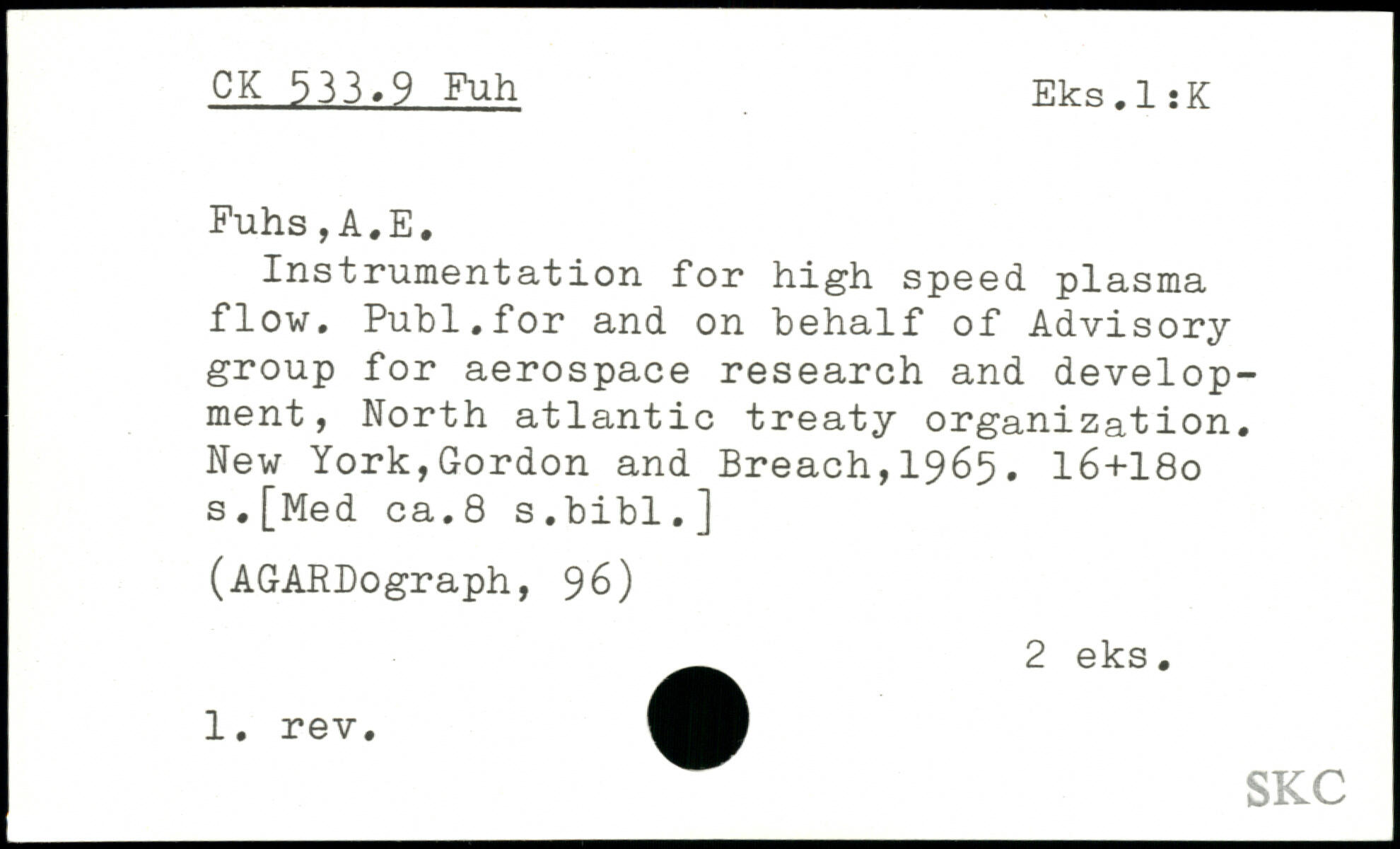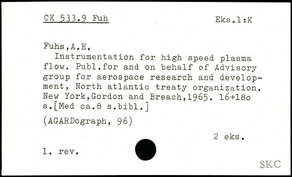 Instrumentation for high speed plasma flow. Publ.for and on behalf of Advisory group for aerospace research and development, North atlantic treaty organization.