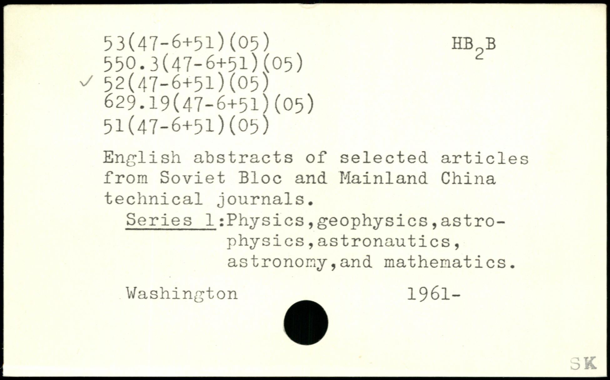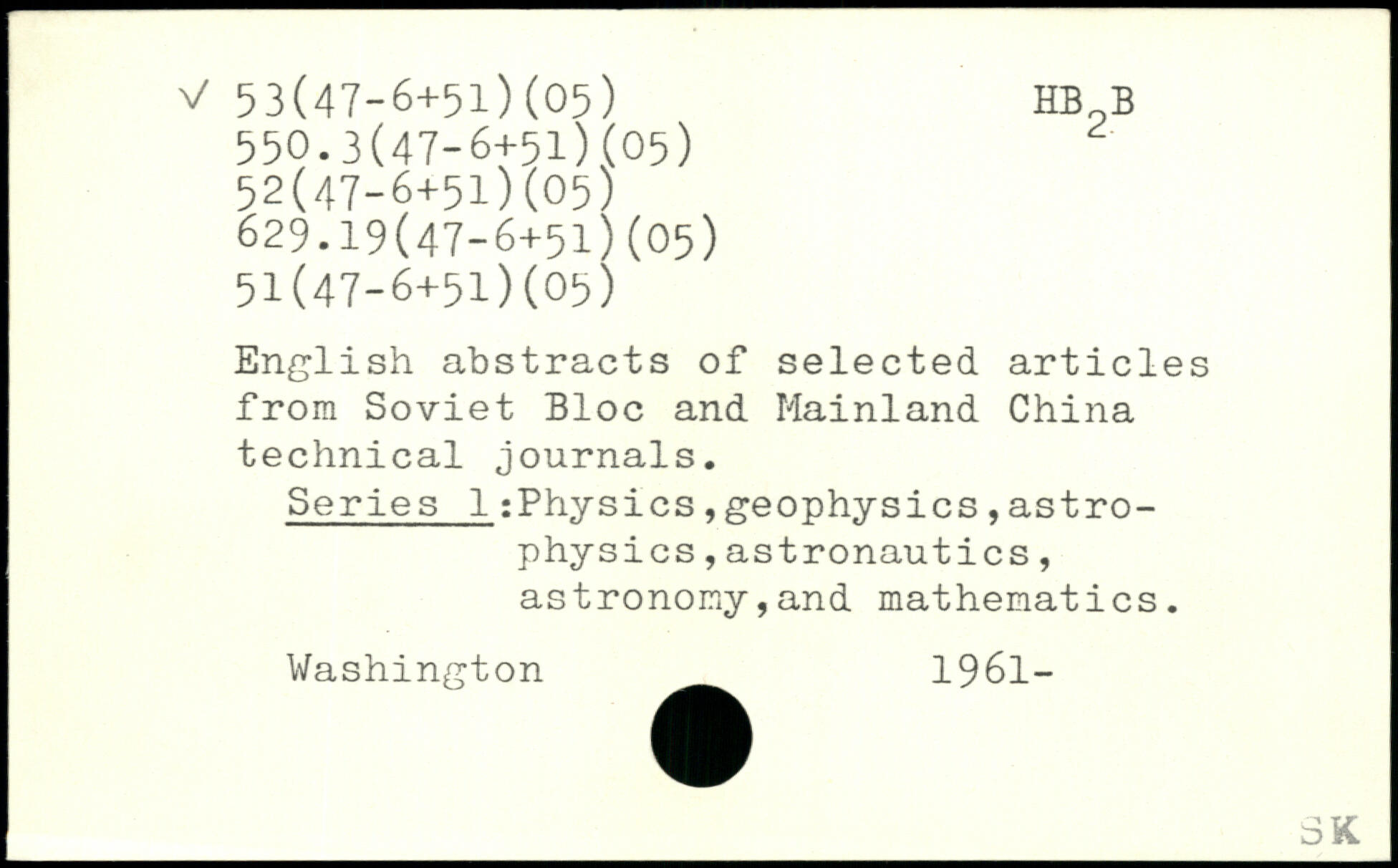 English abstracts of selected articles from Soviet Bloc and Mainland China technical journals. Series l;Physics,geophysics,astrophysics ,astronautics, astronomy,and mathematics. ~. 1561-