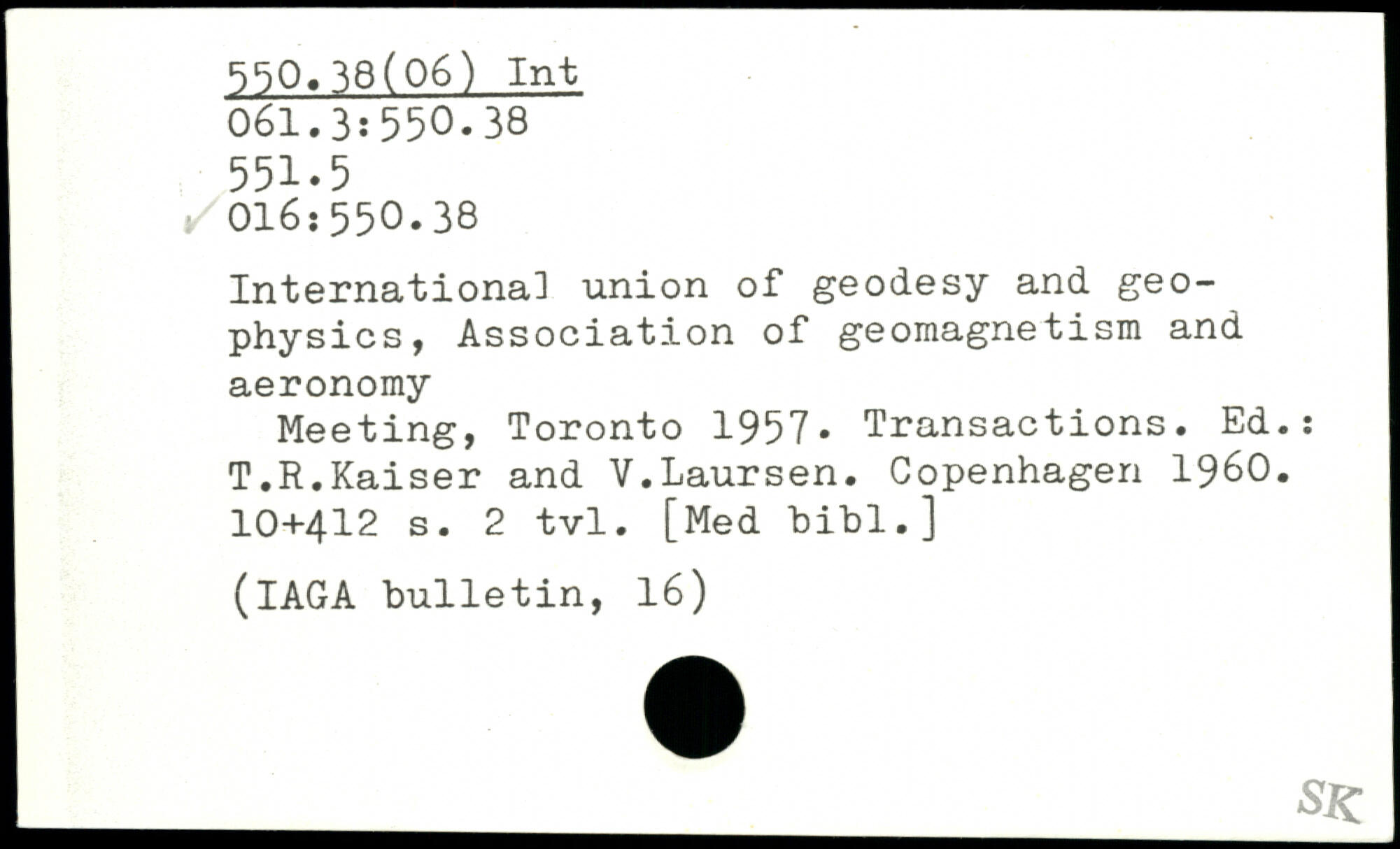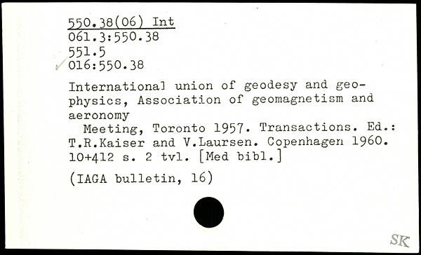 Internationa] union of geodesy and geophysics, Association of geomagnetism and aeronomy Meeting, Toronto 1957, Transactions. Ed.: T.R.Kaiser and V.Laursen.