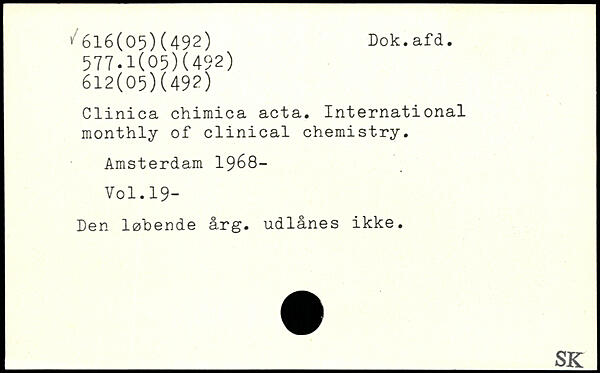 Clinica chimica acta. International monthly of clinical chemistry. Amsterdam 1968- Den løbende årg. udlånes ikke.
