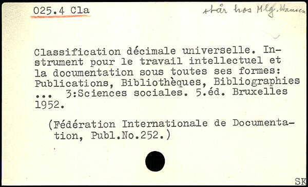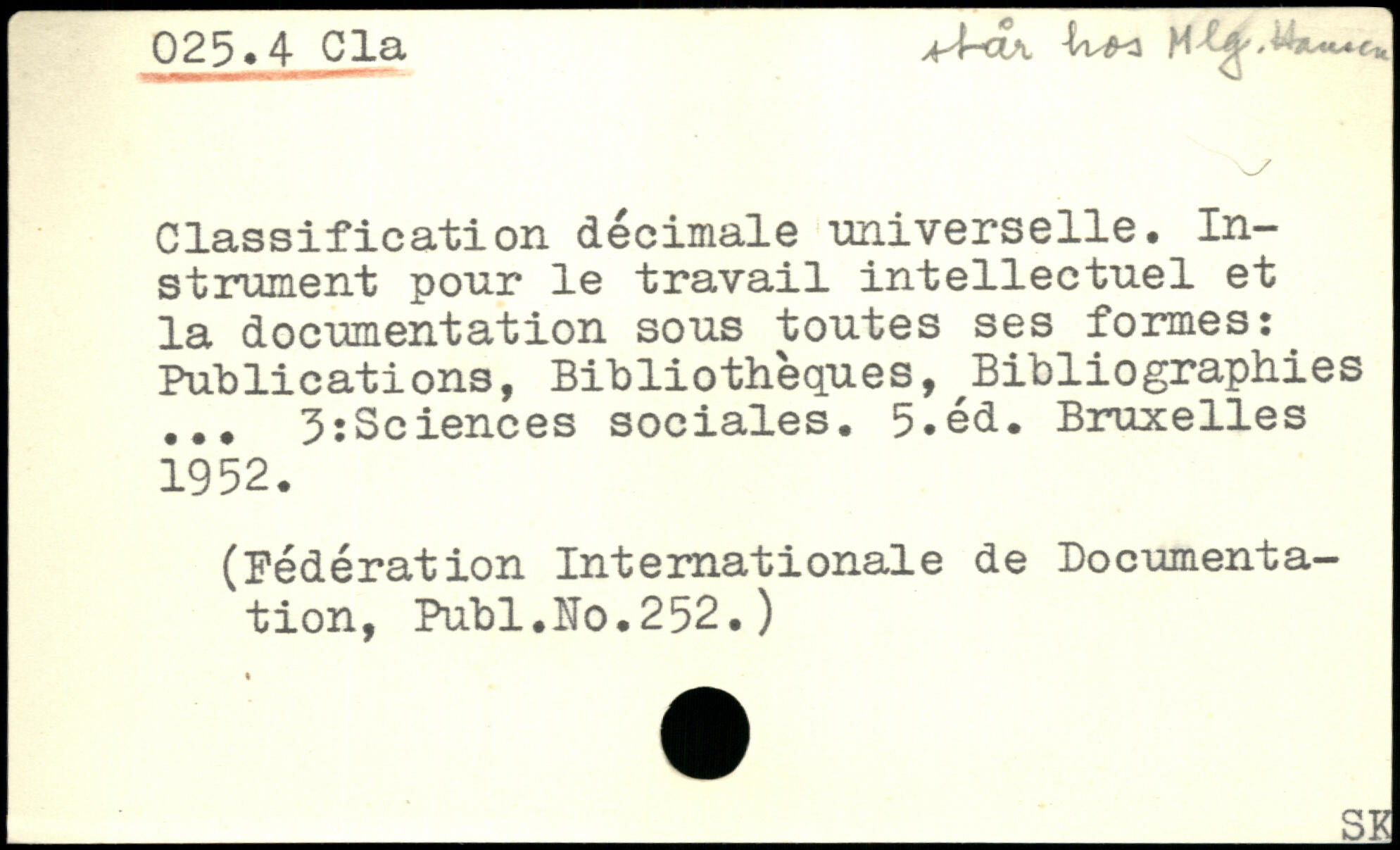 Classification décimale universelle. Instrument pour le travail intellectuel et la documentation sous toutes ses formes Publications, Bibliothèques,^Bibliographies ... 3:Scienees sociales. 5.éd.