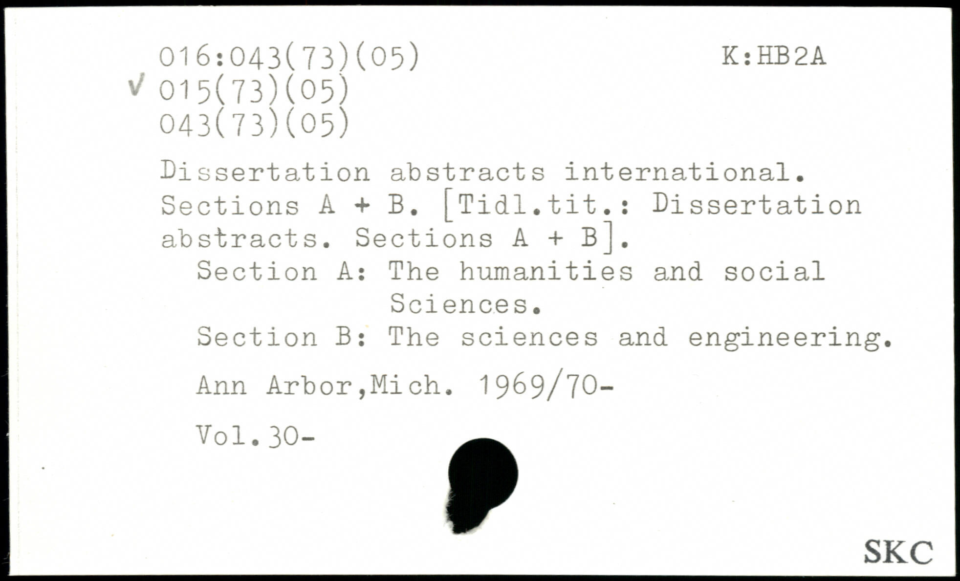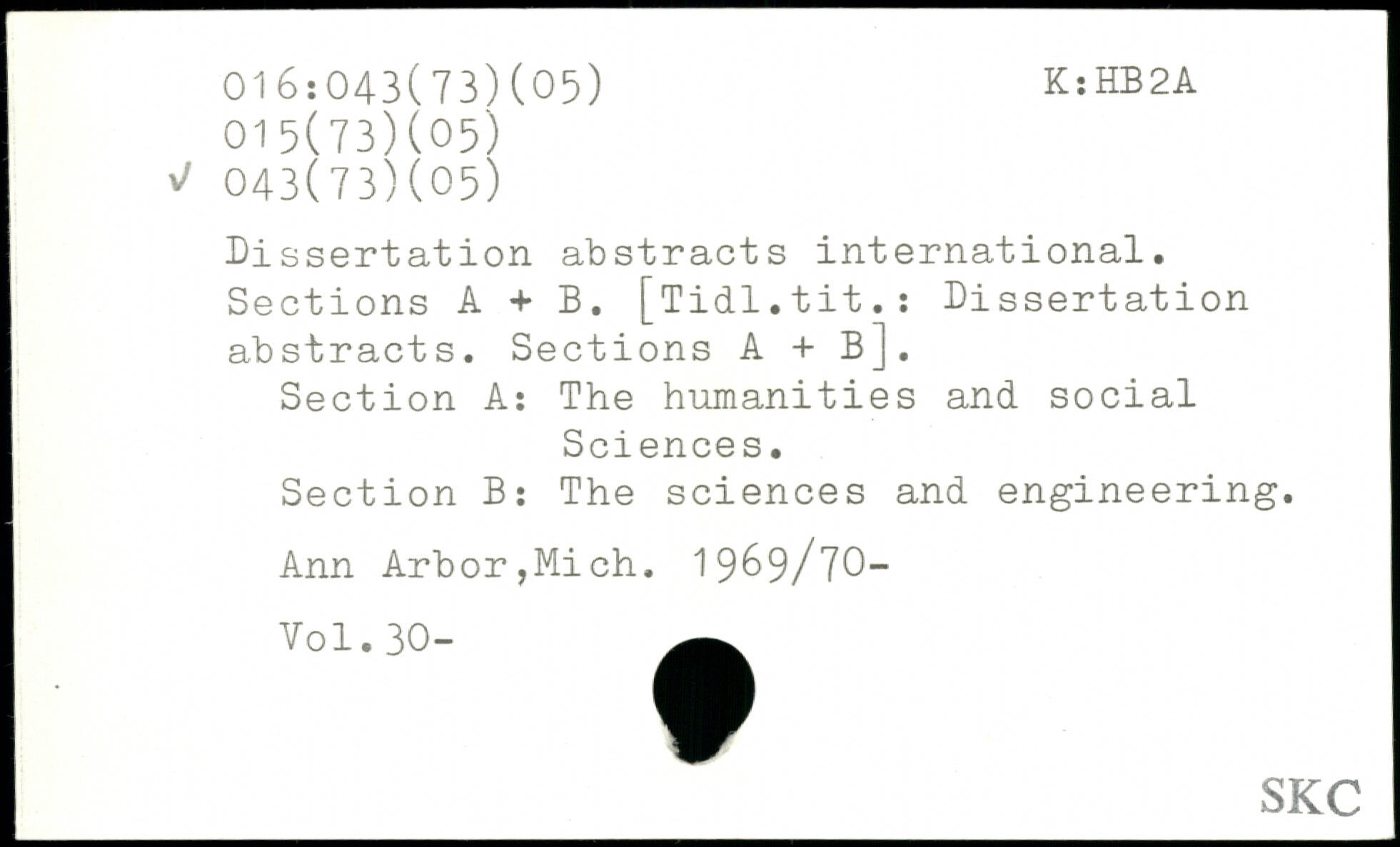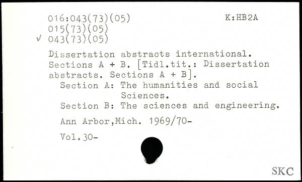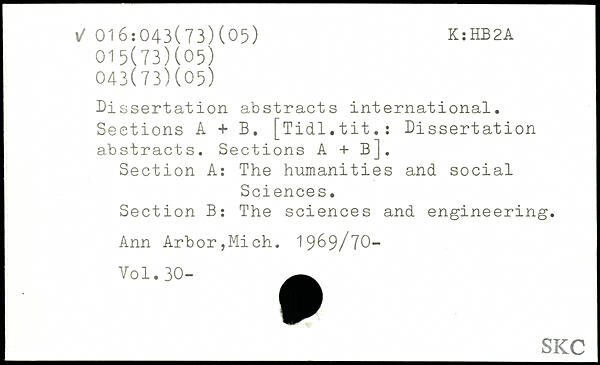 Dissertation abstracts international. Sections A + B. [Tidl.tit.: Dissertation abstracts. Sections A + B]. Section A: The humanities and social Sciences. Section B: The sciences and engineering. Ann Arbor,Mich. 1969/70-