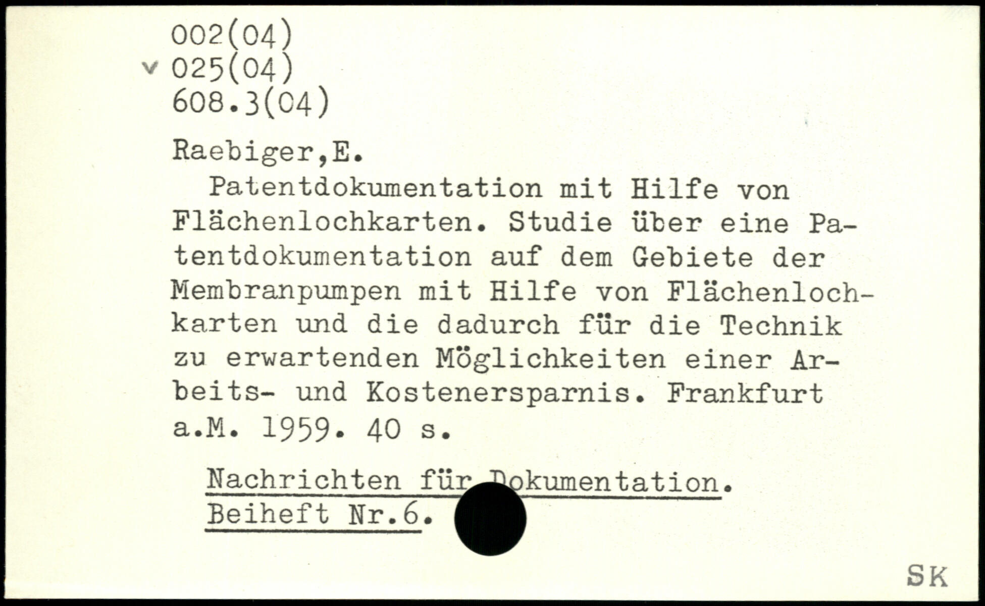 Patentdokumentation mit Hilfe von Flächenlochkarten. Studie über eine Patentdokumentation auf dem Gebiete der Membranpumpen mit Hilfe von Flächenlochkarten und die dadurch für die Technik zu erwartenden Möglichkeiten einer Ar-beits- und Kostenersparnis. Frankfurt a.M. 1959-