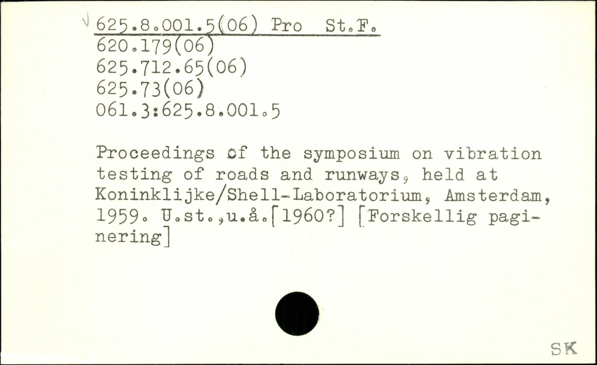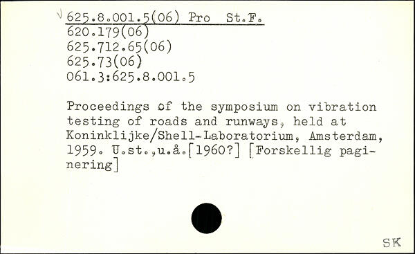 Proceedings of the symposium on vibration testing of roads and runways9 held at Koninklijke/Shell-Laboratoriums Amsterdam, 1959. U.st,,u.å.[1960?] [Forskellig paginering]