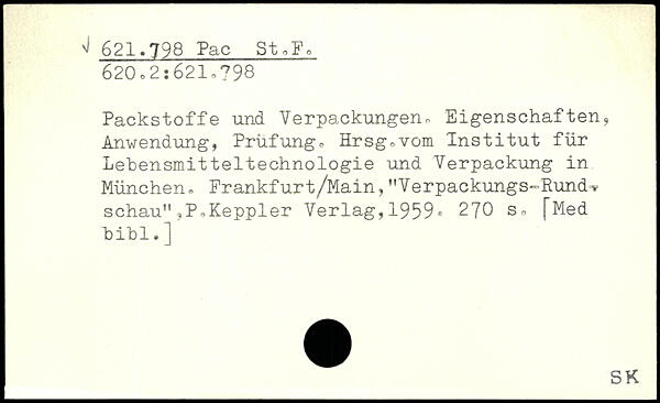 Packstoffe und Verpackungen. Eigenschaften, Anwendung, Prüfung. Hrsgovom Institut für Lebensmitteltechnologie und Verpackung in München. Frankfurt/Main,"Verpackungs-Rund-. schau"jP.Keppler Verlag,1959-