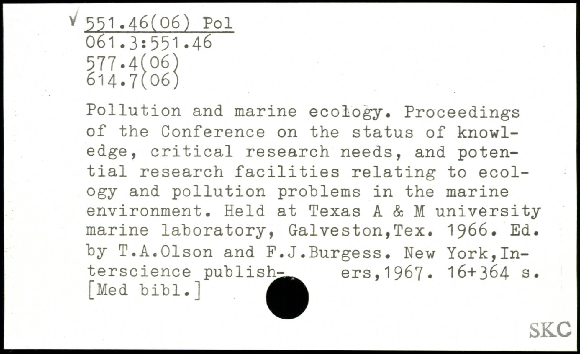 Pollution and marine ecology. Proceedings of the Conference on the status of knowledge, critical research needs, and potential research facilities relating to ecology and pollution problems in the marine environment. Held at Texas A & M university marine laboratory, Galveston,Tex. 1966. Ed. by T.A.Olson and F.J.Burgess. New York,Interscience publish^^ ers,1967.