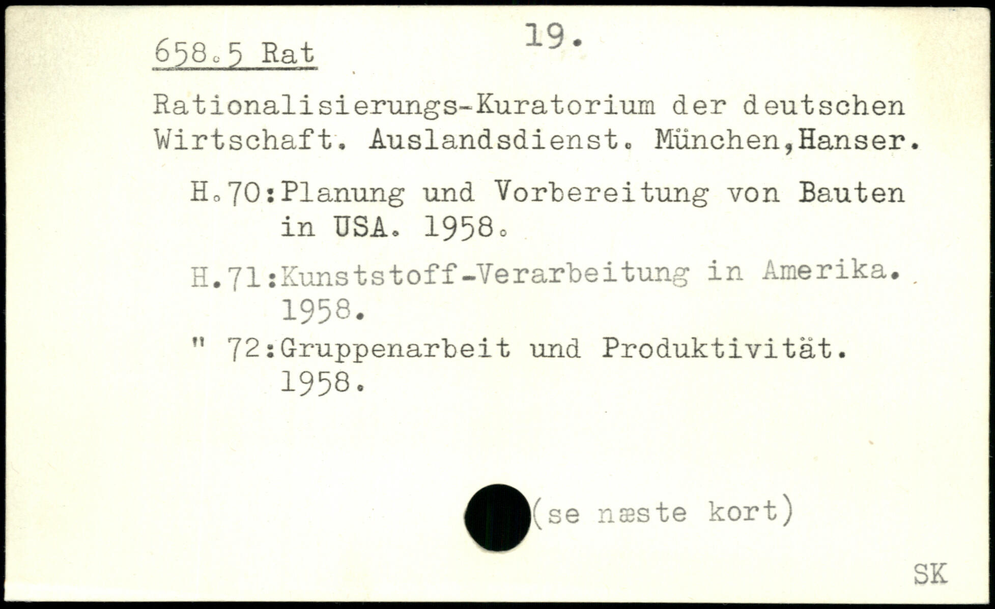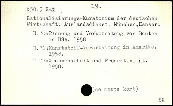 Rationalisierungs-Kuratorium der deutschen Wirtschaft. Auslandsdienst. München,Hanser. H070:Planung und Vorbereitung von Bauten in USA. 1958c H.71iKunststoff-Verarbeitung in Amerika. 1958. " 72:Gruppenarbeit und Produktivität. 1958. ^^^(se næste kort)
