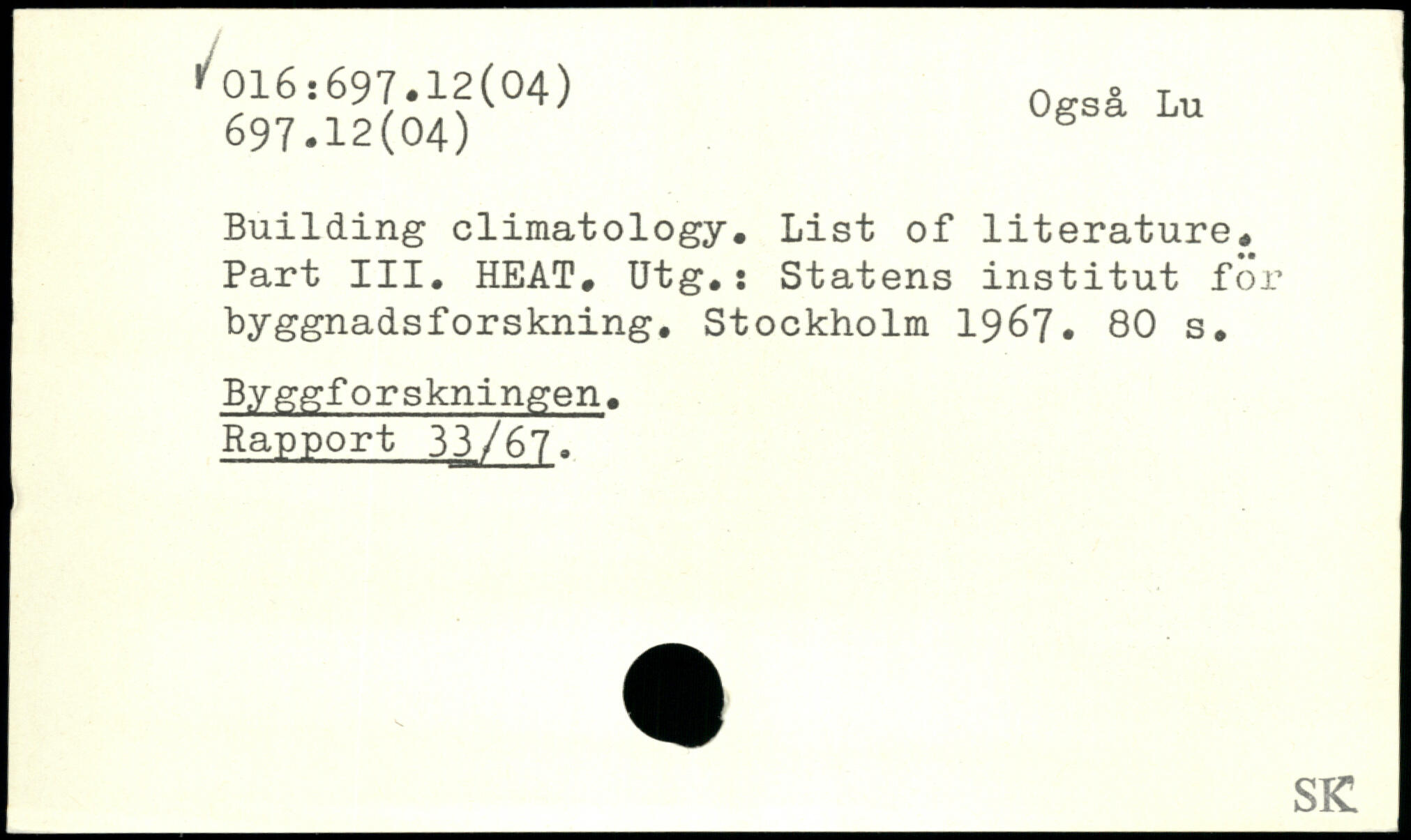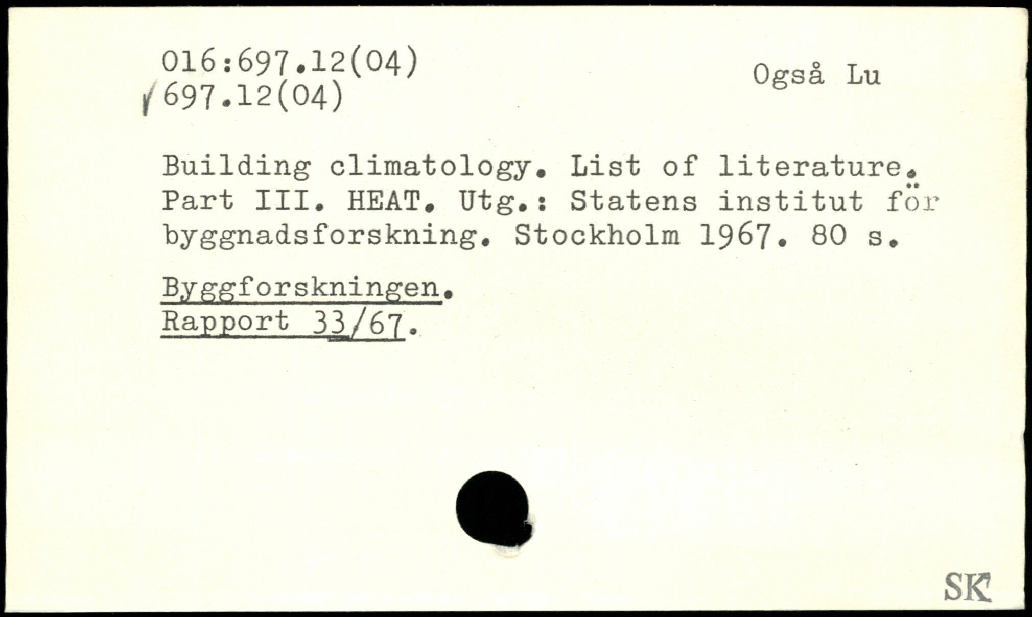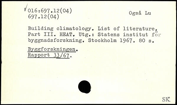 Building climatology. List of literature. Part III. HEAT. Utg.: Statens institut for byggnadsforskning.