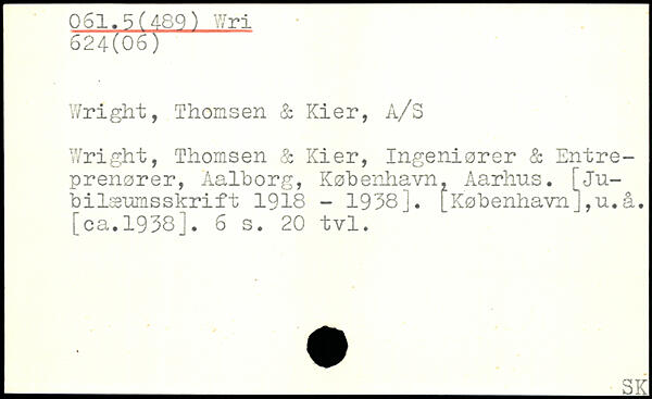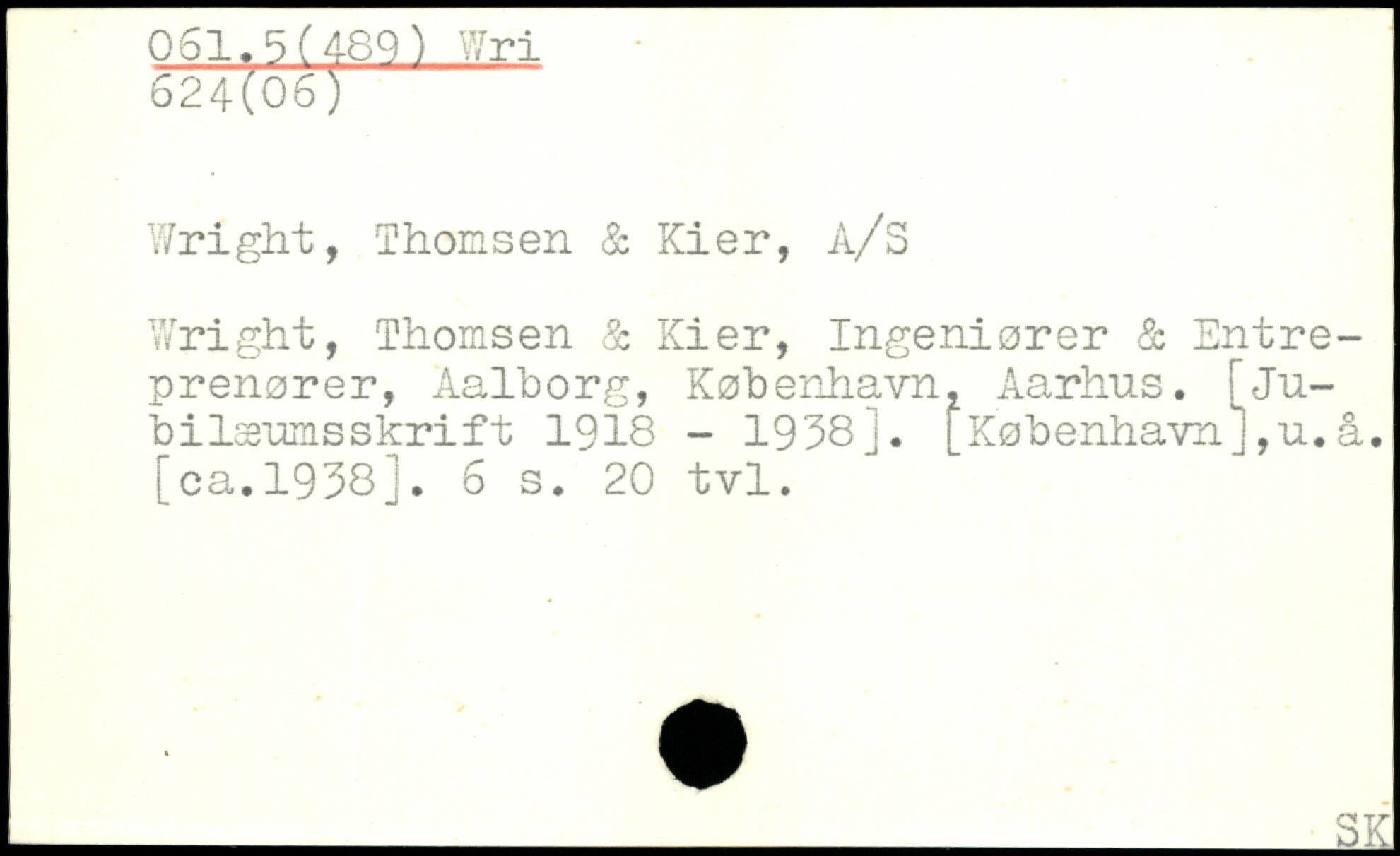 Wright, Thomsen & Kier, A/S Wright, Thomsen & Kier, Ingeniører & Entreprenører, Aalborg, København, Aarhus. [Jubilæumsskrift 1918 - 1938j. [KøbenhavnJ,u.å. [ea,1938j.