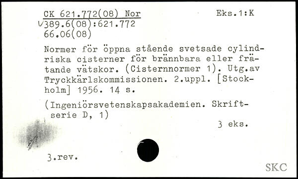 Normer för öppna stående svetsade cylindriska cisterner för brännbara eller frätande vätskor. (Cisternnormer 1). Utg.av Tryckkärlskommissionen.