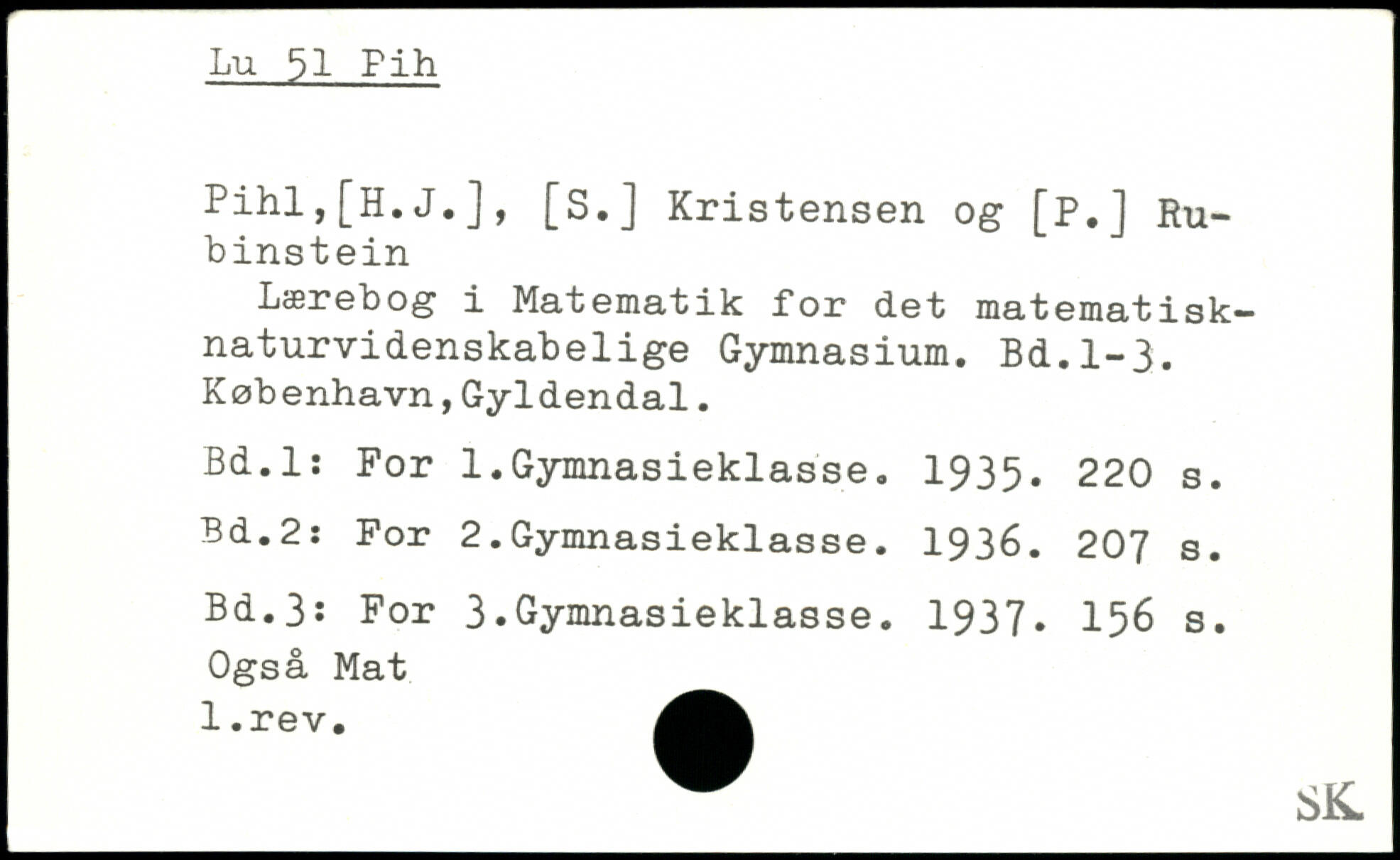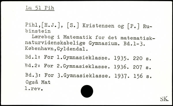 Pihl,[H.J.], [S.] Kristensen og [P.] Rubinstein Lærebog i Matematik for det matematisknaturvidenskabelige Gymnasium.
