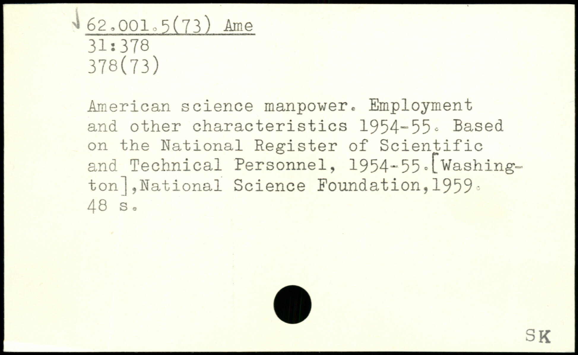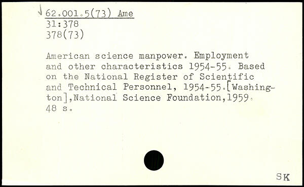American science manpower. Employment and other characteristics 1954-55. Based on the National Register of Scientific and Technical Personnel, 1954-55,[Washington] ,National Science Foundation,1959.