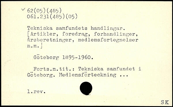 Tekniska samfundets handlingar. [Artikler, foredrag, forhandlinger, årsberetninger, medlemsfortegneiser m. m. j Goteborg 1895-1960. Port s.m.tit.: Tekniska samfundet i Goteborg. Medlemsförteckning ...