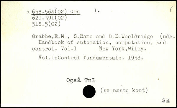 Grabbe,EM, SoRamo and DoE,Wooldridge (udg. Handbook of automation, computation, and control, Volol New York,Wiley. Vol.lsControl fundamentals, 1958. Også TnL