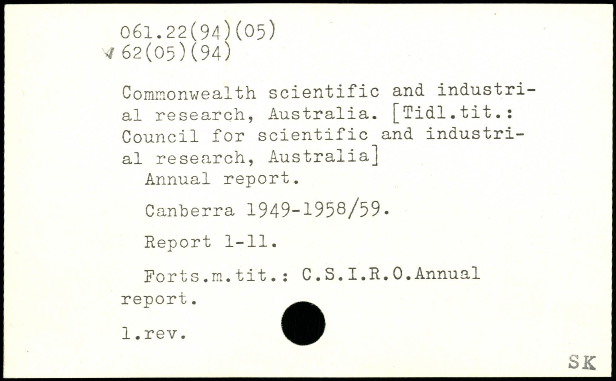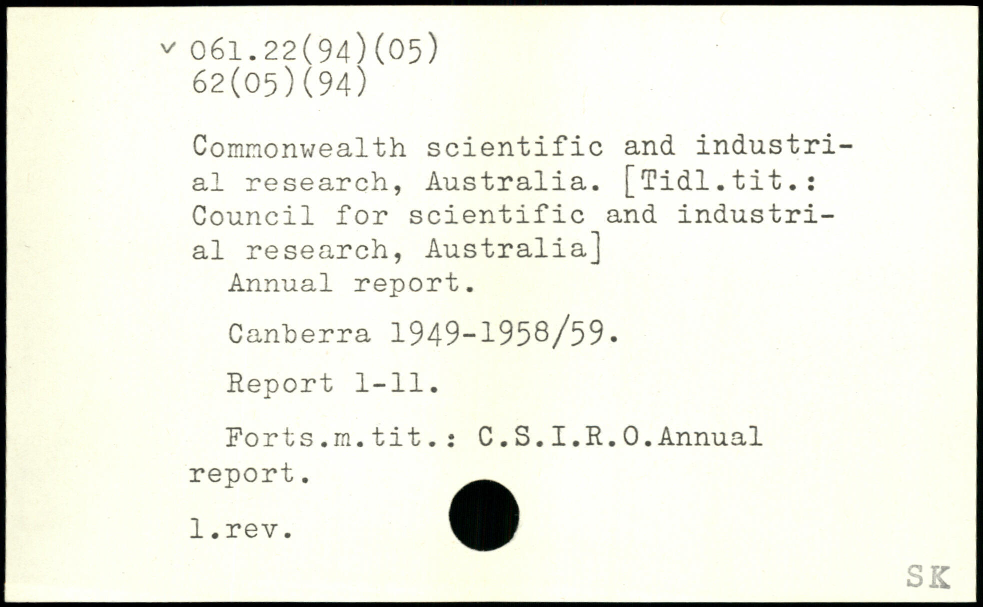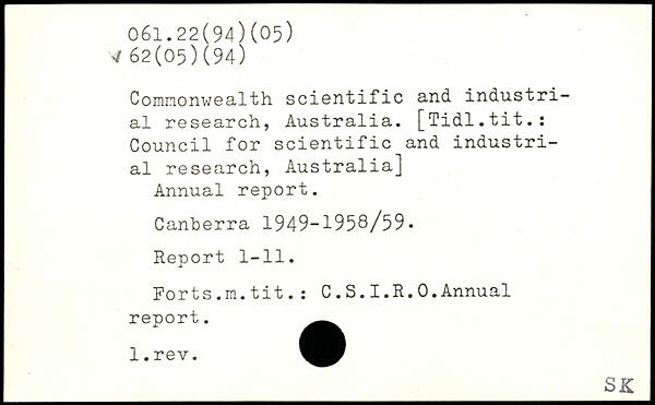 Commonwealth scientific and industrial research, Australia. [Tidl.tit.: Council for scientific and industrial research, Australia] Annual report. Canberra 1949-1958/59. Report 1-11. Forts.m.tit.: C.S.I.R.0.Annual report. l.rev.