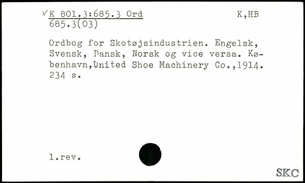 Ordbog for Skotøjsindustrien. Engelsk, Svensk, Pansk, Norsk og vice versa.
