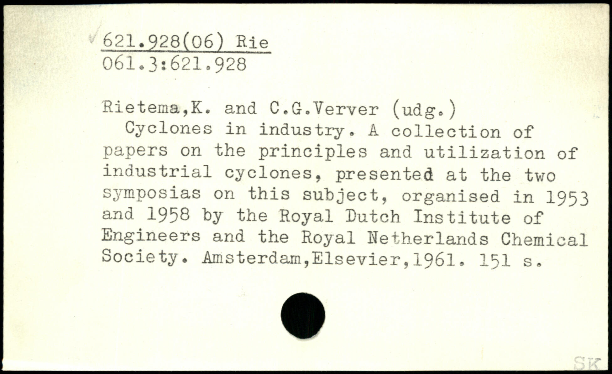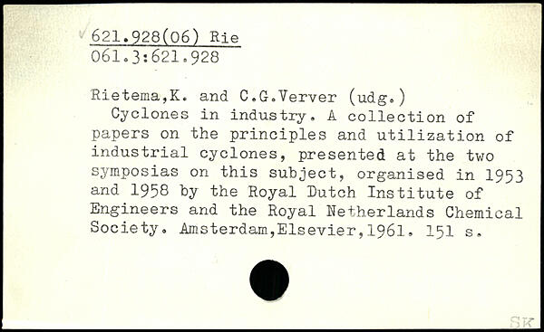 Cyclones in industry. A collection of papers on the principles and utilization of industrial cyclones, presented at the two symposias on this subject, organised in 1953 and 1958 by the Royal butch Institute of Engineers and the Royal Netherlands Chemical Society.
