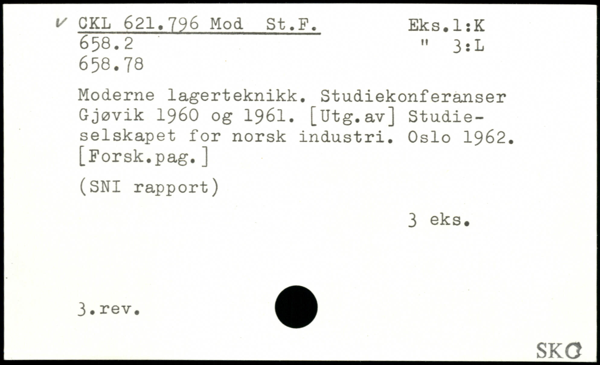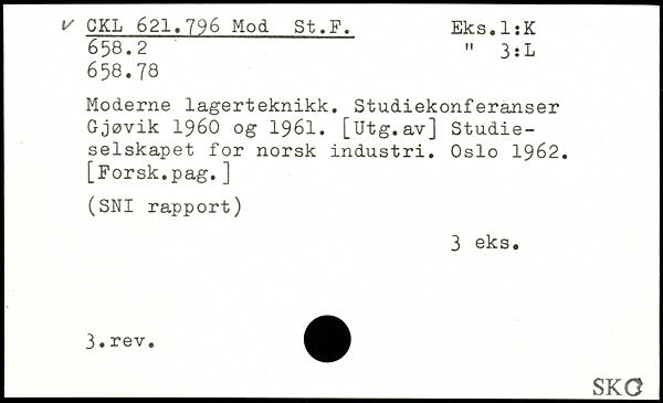 Moderne lagerteknikk. Studiekonferanser Gjøvik 1960 og 1961. [Utg.av] Studieselskapet for norsk industri. Oslo 1962. [Forsk.pag.]