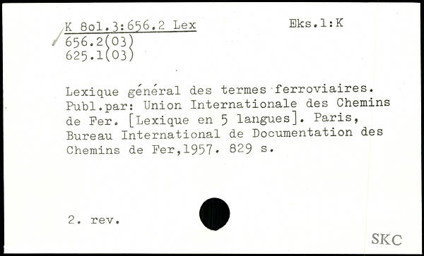 Lexique general des termes ferroviaires. Publ.par: Union Internationale des Chemins de Per. [Lexique en 5 langues]. Paris, Bureau International de Documentation des Chemins de Per,1957