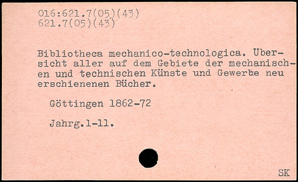 Bibliotheca mechanico-technologica. Übersicht aller auf dem Gebiete der mechanischen und technischen Künste und Gewerbe neu erschienenen Bücher. Göttingen 1862-72 Jahrg.1-11.