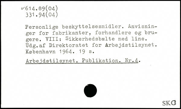 Personlige beskyttelsesmidler. Anvisninger for fabrikanter, forhandlere og brugere. VIII: Sikkerhedsbælte med line. Udg.af Direktoratet for Årbejdstilsynet.