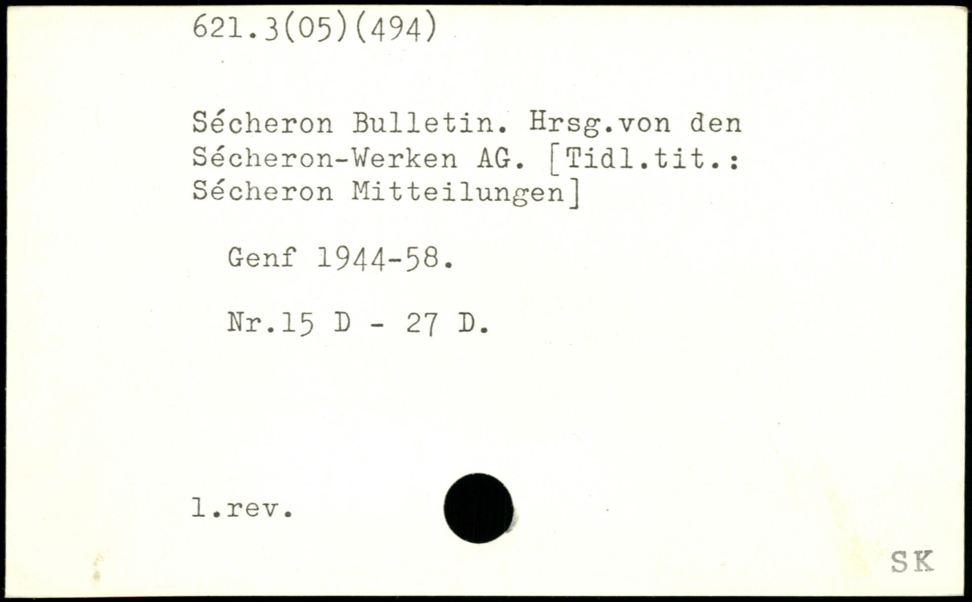 Secheron Bulletin. Hrsg.von den Secheron-Werken AG. [Tidl.tit.: Secheron Mitteilungen] Genf 1944-58. Nr.15 D - 27 D.