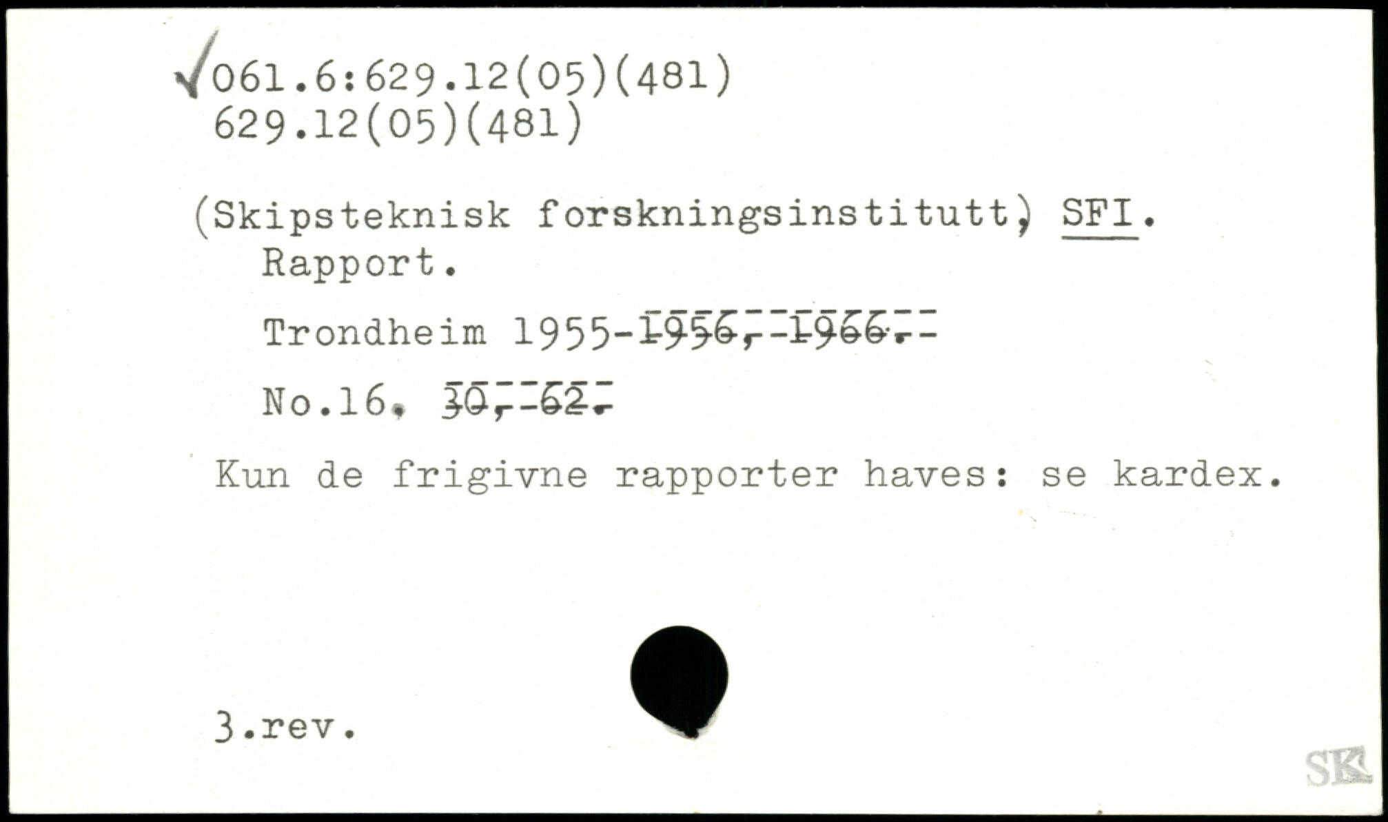 (Skipsteknisk forskningsinstitutt) SFI. Rapport. Trondheim Kun de frigivne rapporter haves: se kardex. SBL
