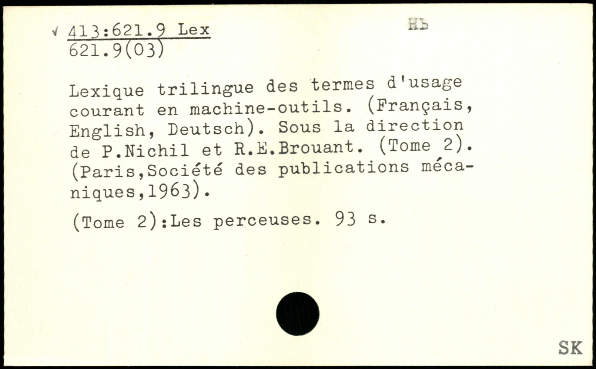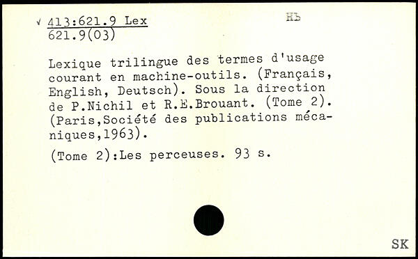 Lexique trilingue des termes d'usage courant en machine-outils. (Français, English, Leutsch). Sous la direction de P.Nichil et R.E.Brouant. (Tome 2). (