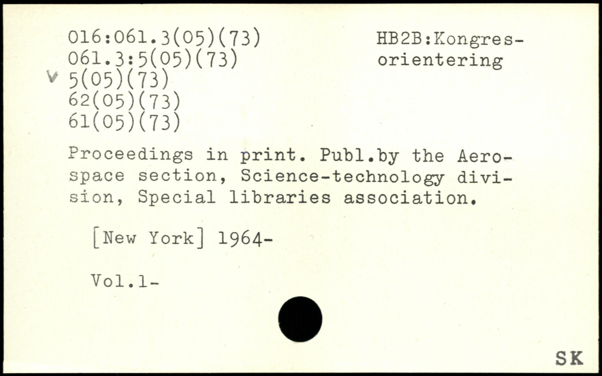 Proceedings in print. Pub 1."by the Aerospace section, Science-technology division, Special libraries association.