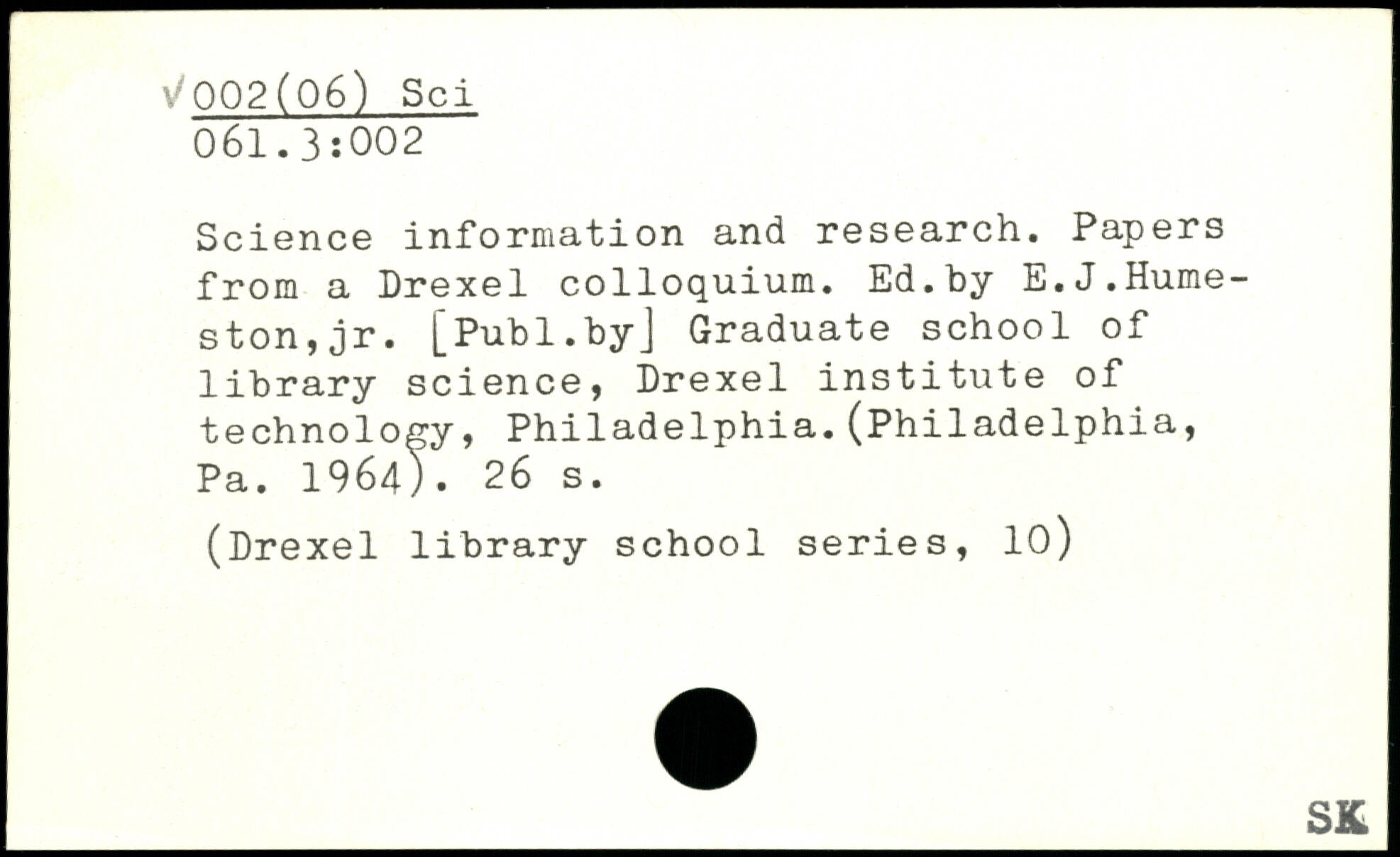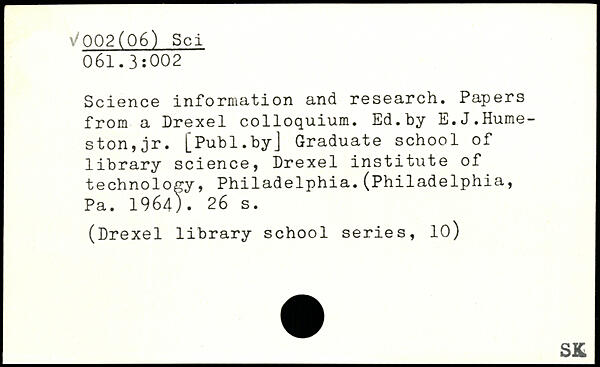 Science information and research. Papers from a Drexel colloquium. Ed.by E.J.Hume-ston,jr.