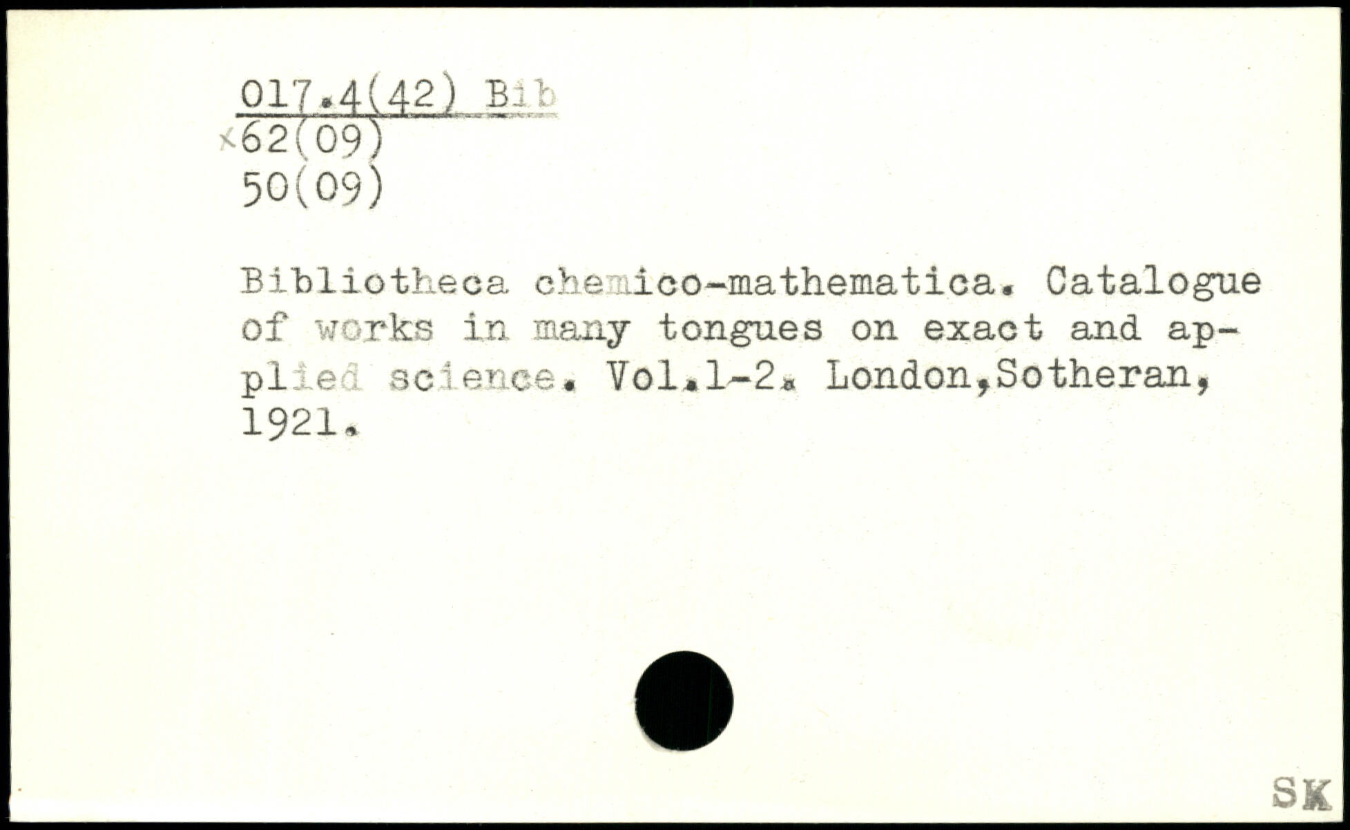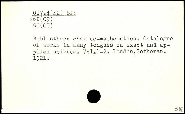 Bibliotheca chemico-mathematica. Catalogue of works in many tongues on exact and applied science. Vol,l~2.