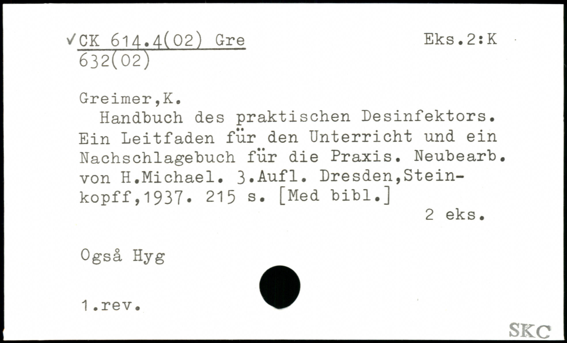 Handbuch des praktischen Desinfektors. Ein Leitfaden für den Unterricht und ein Nachschlagebuch für die Praxis. Neubearb. von H.Michael. ß.Aufl.